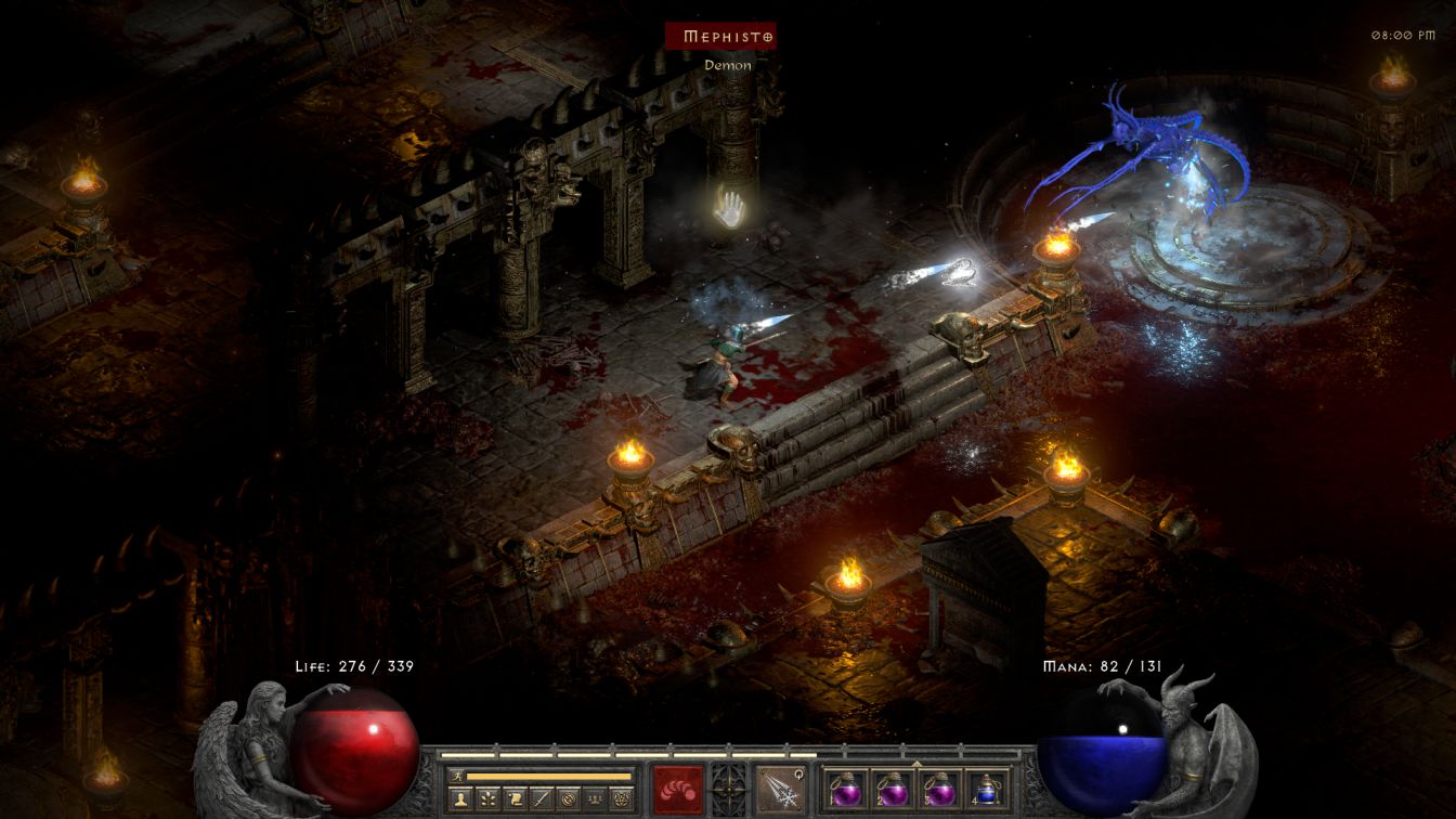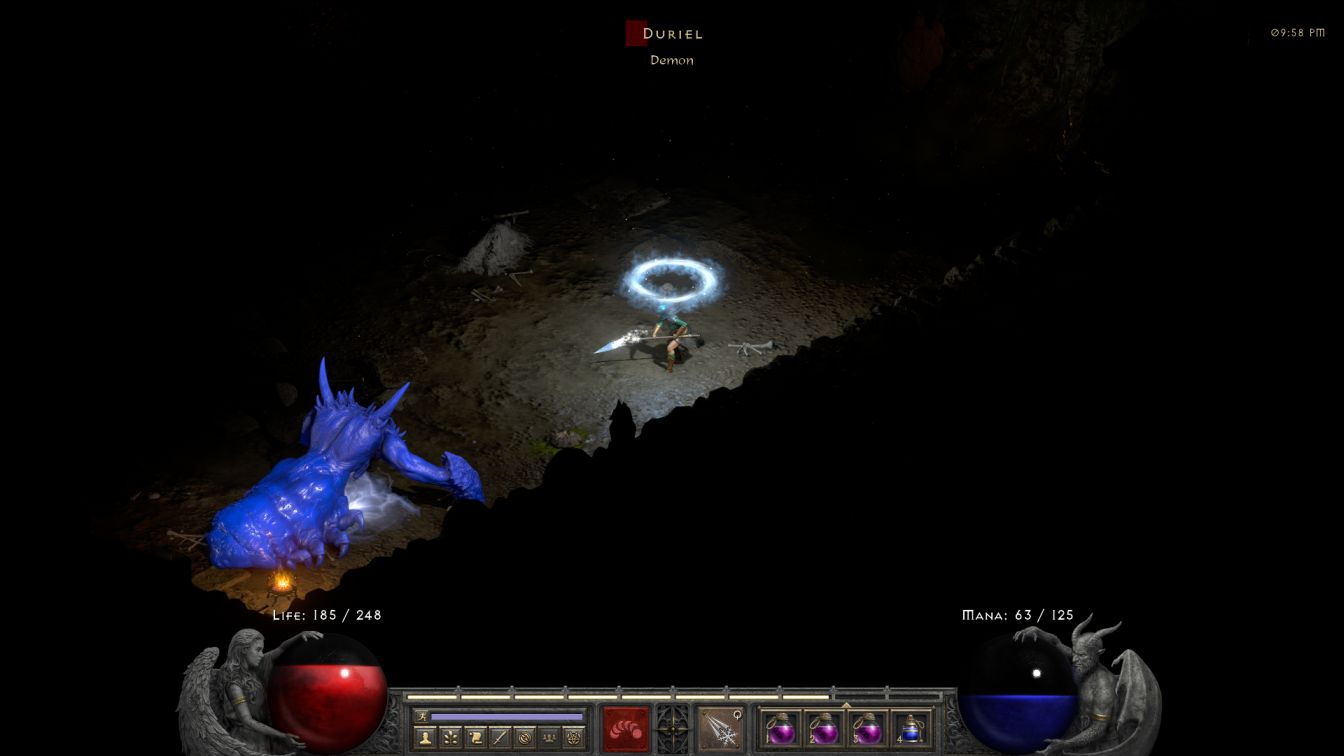 There was a convenient skill shrine located near Mephisto's platform at the back of Durance 3 which I used for some additional damage against the boss. Mephisto was a ranged caster much like Blanche herself and the two of them both sat at long distance tossing spells at one another for several minutes. I kept Blanche far enough away that she wouldn't get hit by Mephisto's poison and could dodge the Charged Bolts without much effort, though despite my best efforts I did get nailed by the lightning and cold shot occasionally. While those things definitely hurt, there was always time to drink a red potion and recover HP before Mephisto's next followup spell. Things never became serious enough to require drinking a purple potion off belt and Blanche wore down Mephisto's healthbar over the course of about two minutes of firing Ice Bolts. This was a smoother boss fight than Duriel had been.