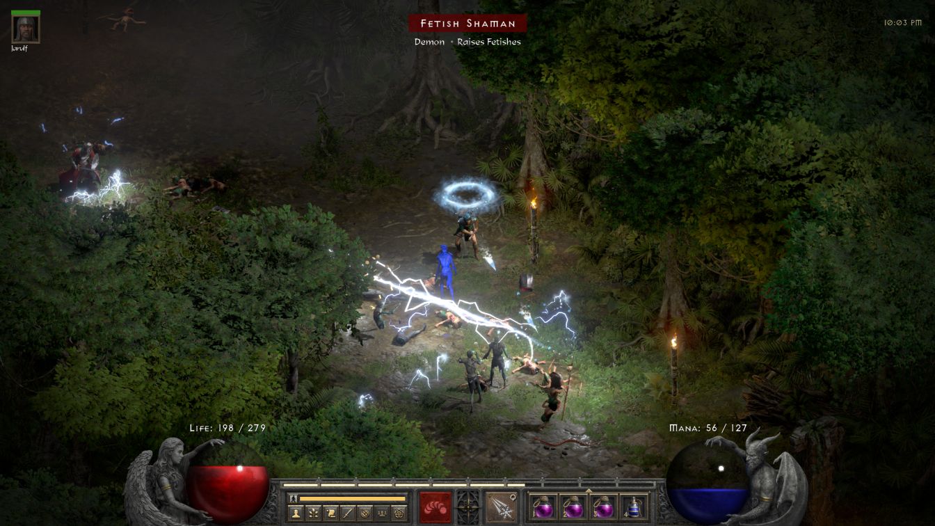 For the moment, Jarulf was a helpful addition to the team who kicked in some extra damage without drawing too much attention to himself. I liked the fact that the Act Three mercenaries imitate the Act One rogues by largely staying out of trouble, preferring to remain at range as opposed to the Act Two mercenaries who are impossible to keep alive for long against major threats. Jarulf had three spells at his disposal: Charged Bolt, Lightning, and Static Field. All of them were sitting at low levels for the moment, especially Static Field which had a range of only a few yards, and Charged Bolt was effectively useless at the moment since the damage was so low. Lightning seemed to be the best choice at killing enemies as it could roll anywhere from 1-100 damage. Often the lightning bolts would roll low damage and do nothing, however at least some of the time they would roll on the high end and blast apart a line of fetishes. I hadn't collected any equipment ahead of time for Jarulf so he was making due with random garbage for the moment. This was also a blessing of sorts in disguise: the Act Three mercenaries do poorly in late game comparisons because their damage doesn't scale with their equipment... but conversely, not having gear for Jarulf also didn't hurt his damage! Ideally, I would get him a Spirit sword of his own along with a Lore helmet for some +skills additions to his damage. First I'd have to get those very items for Blanche though.