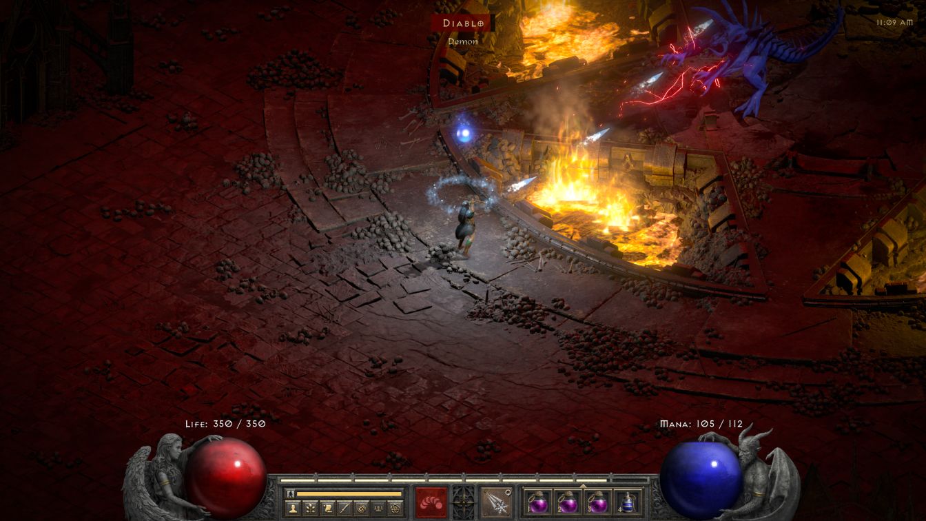 Diablo spent most of his duel with Blanche hanging out on the central pentagram. I was quite content to keep him up there as Blanche launched Ice Bolts from a distance, taking advantage of a mana regen shrine that had been located nearby. Ice Bolt's range extends for about the length of a full screen and this was more or less the maximum range at which Blanche could hit something. Diablo mixed up his various abilities, all of which were far enough away that Blanche could avoid taking full damage. She still only had about 30% fire resistance and I didn't want to find out what would happen from eating an entire Flave Wave or Lightning Breath of Doom. Most of the damage Blanche took came from Diablo's Flame Nova which is essentially undodgeable and took out 40-50 HP at a time from her health orb. Eventually Diablo made his way off the pentagram with about a quarter of his health remaining, then ran around in circles trying to hit Blanche. Once again the chilling effect from Ice Bolt was legitimately quite helpful as I continued pelting him with more spells. Blanche emerged victorious after about three minutes of combat; I never had to return to town for more potions but the supply had been getting low when Big D keeled over.