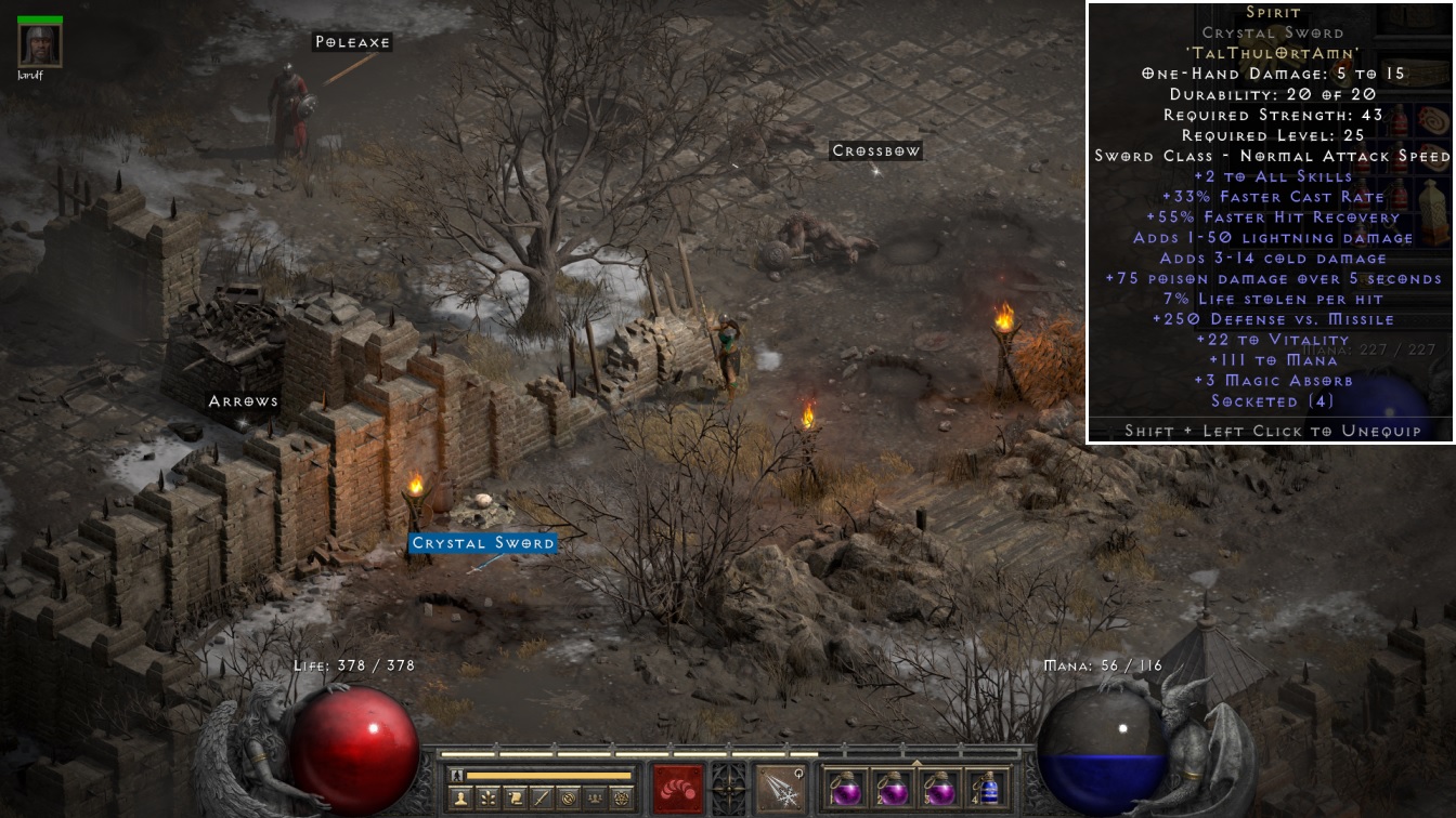 There it was, a Crystal Sword appearing from some random monster drop in the Arreat Plateau. When this particular sword drops in Act Four or Act Five Normal, it will always have a maximum of four possible sockets which makes it the perfect choice for the Spirit runeword with its low Strength requirement. I didn't try to mess around with the Horadric Cube recipe that can add sockets to an item, which would have had 50% odds to roll with the desired four sockets (along with 1 in 6 odds to roll each of one, two, or three sockets). No, I used the Larzuk quest reward immediately to make Spirit as this item was far too important for Blanche to mess around with a bad streak of RNG luck. As I've written a bunch of previous times, the Spirit runeword is way, way too good in terms of what it offers. There's literally everything possible here for a casting build: +2 to all skills, faster cast, faster hit recovery, a nice boost to health, and a massive increase in mana. The 111 mana on this item almost literally doubled Blanche's mana total! She had been drinking a lot of mana potions previously and now her mana problems were a thing of the past.