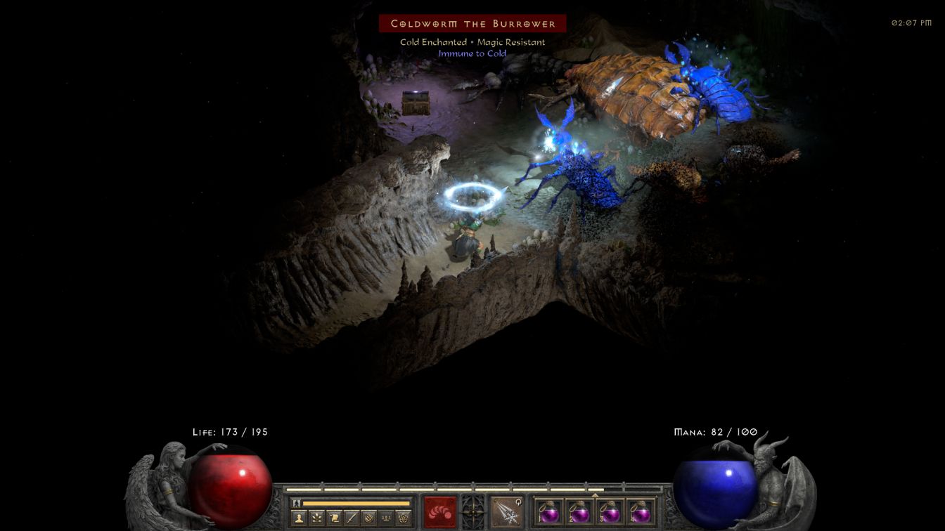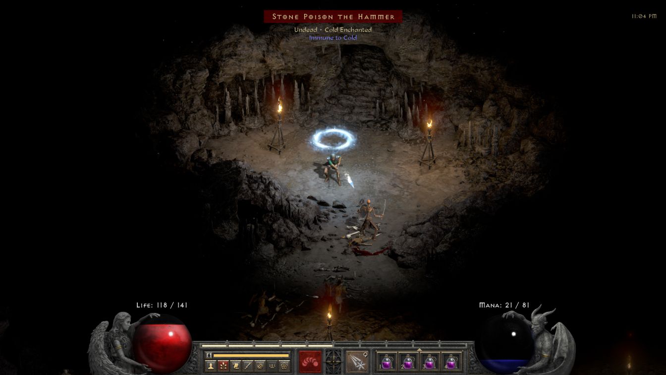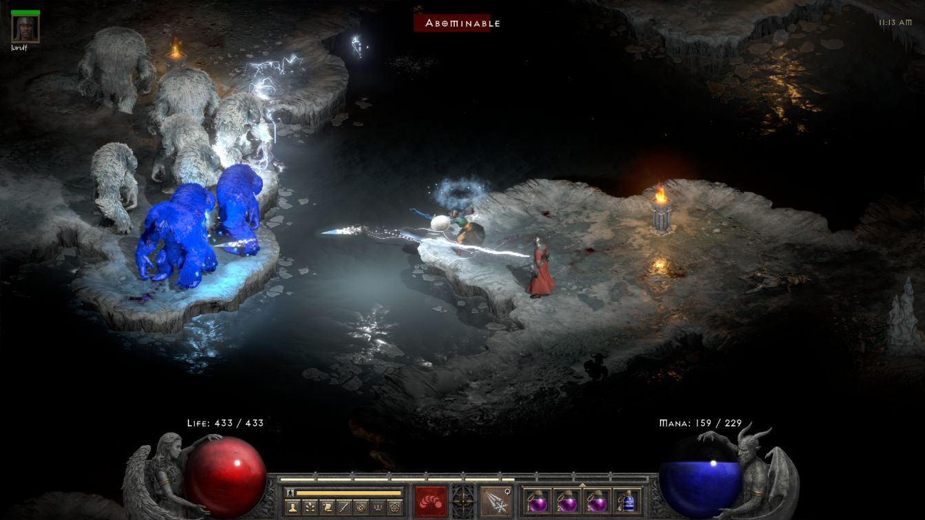 The other big change in Act Five is that the player suddenly starts leveling at an incredible rate after having gained barely three levels across the entirety of Acts Three and Four. Blanche had already maxed out Ice Bolt so she was skilling Ice Blast for its synergy properties, pausing at CLVL 30 to drop a single skill point into the aforementioned Cold Mastery. That skill immediately went to SLVL 1+3 for -35% cold resistance applied against all monsters, effectively an increase in damage of 35% against anything with no resistance (yes, enemies will go into negative resistance territory in D2). Cold Mastery was even more useful against the foes that did have cold resistance, as the frozen ice monsters in the underground caves decreased from 75% resistance down to 40% resistance which more than doubled the damage dealt. (If Blanche dealt 100 damage per shot, she would increase from 25 damage to 60 damage in these situations.) It still took a lot of casts to defeat those things along with the pictured yetis since both monster types had high HP totals, however Blanche would have taken far longer without having Cold Mastery to fall back upon.