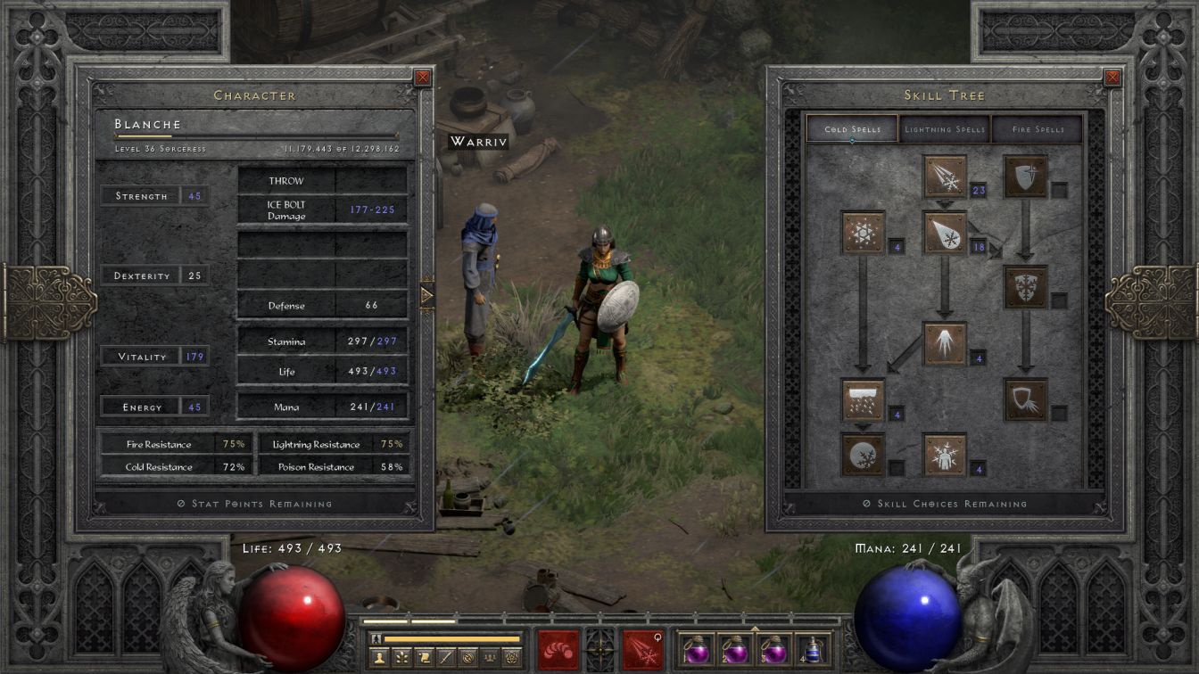 Blanche continued to make use of exactly one spell, the very basic Ice Bolt, which had been maxed out at SLVL 20+3. The base damage of this skill is only 48-61 per casting, however that was being juiced up by a whole lot of synergy skill points in Ice Blast which each added 15% more damage per level, translating into another 7-9 damage apiece. Again this probably didn't sound like that much, and Blanche was planning on switching over to the superior Ice Blast for Hell difficulty, but it was enough to reach the 177-225 damage pictured above which sufficed for the moment. Blanche's offensive output was also bolstered by having the Cold Mastery skill in effect which lowered enemy cold resistance by 35%. This translated in practice into 35% additional damage against monsters with no cold resistance and an even bigger boost against those who did resist ice element. Throw in no cooldown timer for the Ice Bolt spell and Blanche having a solid amount of faster cast gear, and it was enough to keep her in a very comfortable position for the start of Nightmare difficulty.
