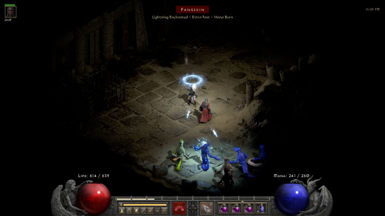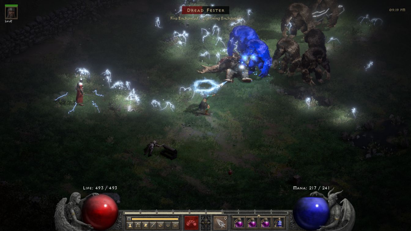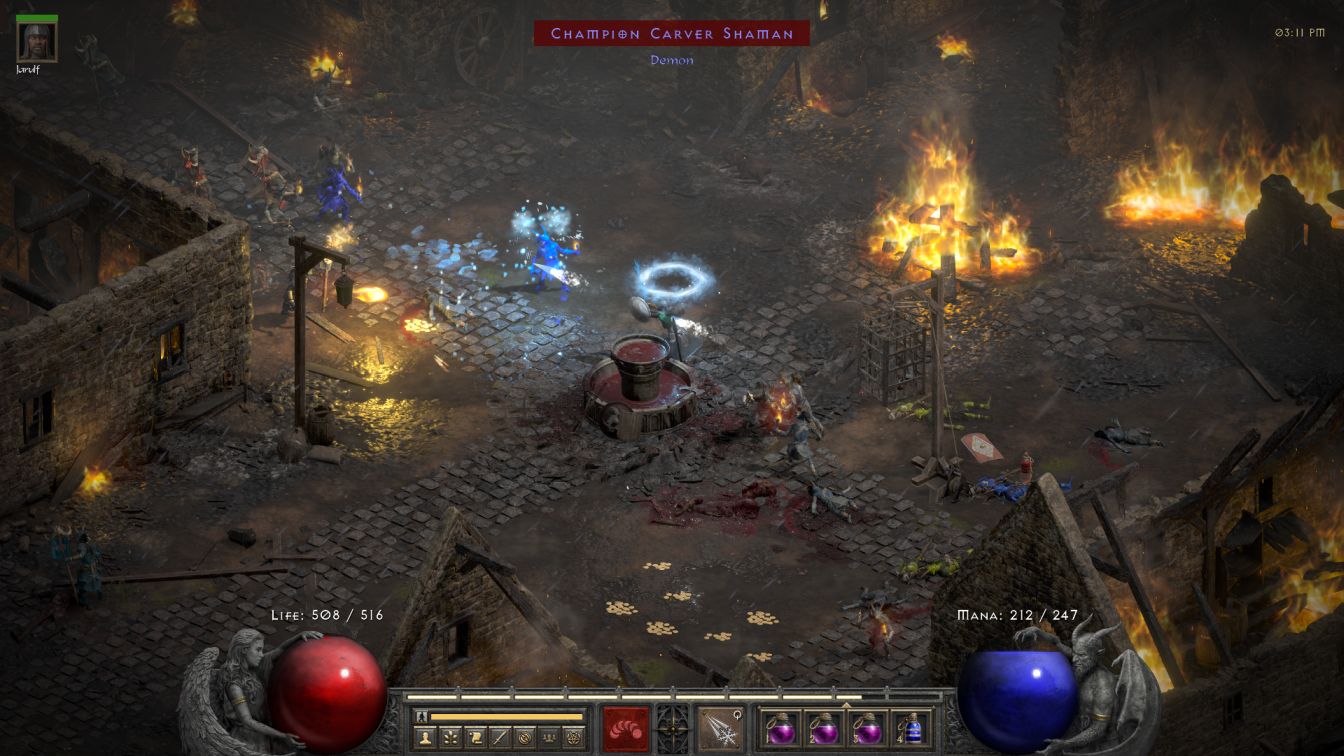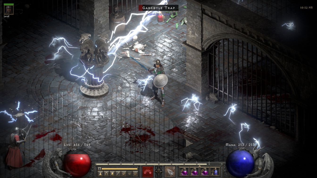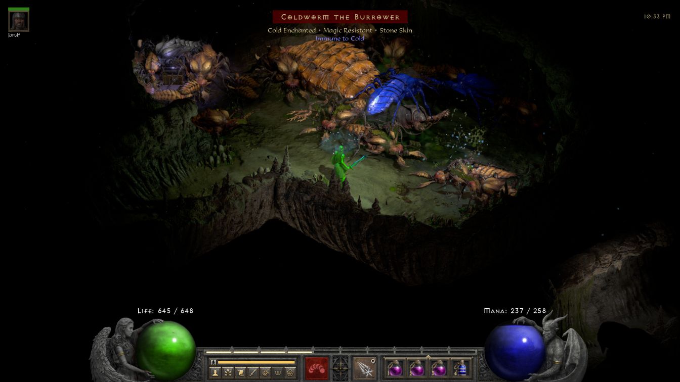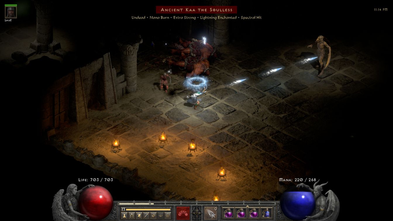 I could have tried this Cube recipe another time if this attempt failed but I knew well from playing Civ games that failing a pair of 50/50 tosses of the dice is hardly unusual. Anyway, Jarulf now had his own Spirit runeword which had rolled slightly worse stats than the one that Blanche was using. His item had 2% less faster cast and a whole 1 point of mana fewer, heh. Unfortunately the bonuses to Vitality and mana were useless here (mercenaries benefit from additional life on items but do not have Vitality as a stat), however the real gain was the +2 to all skills. I checked and this item did bump up Jarulf's three lightning element skills by two points apiece. The Act Three mercenaries currently do benefit from equipment with +skills on it along with faster cast gear (they did not benefit from either prior to Diablo 2 Resurrected) which at least makes them somewhat viable as opposed to their prior utterly pathetic status. Jarulf wasn't exactly doing a whole lot at the moment, though his Lightning skill would occasionally roll high on damage and take out some carvers and his Static Field could be useful against bosses. The real test would come against Cold Immune targets against which Blanche was helpless until much later on when she could start using that cold sunder charm.