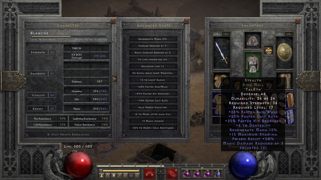 This was, by far, the latest Stealth that I'd ever created for one of my casting characters. All of the "faster" stats were highly useful on Blanche now that it finally showed up: faster movement speed to dodge enemies, faster hit recovery when she did get hit, and more faster cast. Blanche was getting 33% faster cast from her Spirit sword and then another 20% faster cast from jewelry for 78% faster cast total. This put her at a bit of an awkward spot, well above the 63% needed for the 9 frame casting animation while also well below the 105% required to hit the next frame breakpoint. (Yes, any fast casting total between those two numbers does nothing for a Sorceress, and no, Diablo 2 doesn't explain this at all to the player.) I resolved to drop Blanche's 10% faster cast amulet though I might want to bring back some faster cast stuff if she added a Spirit shield runeword in Hell difficulty. I knew from Electric Tsunami's experience that hitting the 105% faster cast target is super fun to experience.