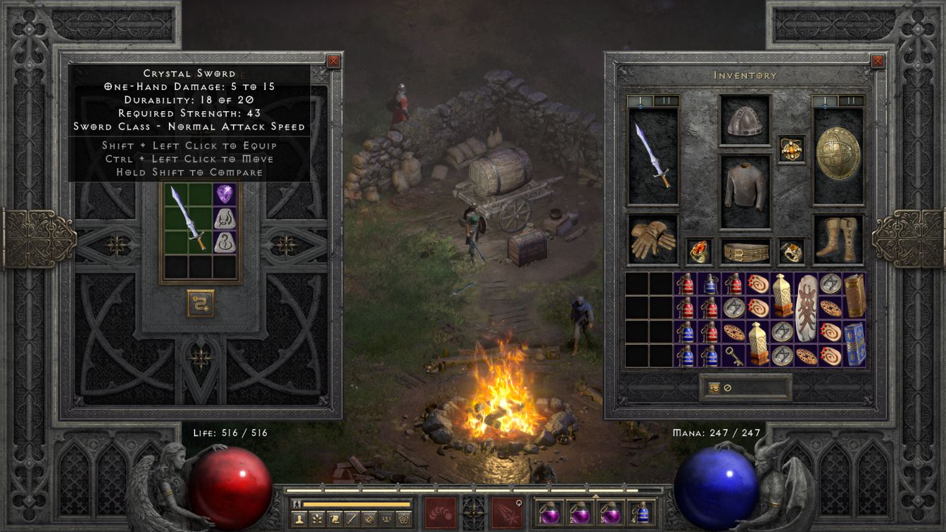 Back in Act Five, Blanche had taken the first Crystal Sword that dropped and used her socket quest on it. That guaranteed it would roll with four sockets and allowed her to create a Spirit runeword. Two other Crystal Swords had dropped over the course of the Act, however, and I could use a Horadric Cube recipe to try and get the magic four sockets in them as well. Ort + Amn + a Perfect Amethyst will add sockets to a normal (white) weapon. The amount that appears is a straight dice roll from 1 to 6, with the weapon getting whatever the maximum number of sockets it can hold if it rolls higher than what's allowed. The Crystal Swords that are generated at an item level between 26 and 40 can have a maximum of four sockets, and this item level happens to correspond to Act Five Normal and early Act One Nightmare. The Cube recipe therefore had 50% odds to get the desired four sockets (on a roll of 4, 5, or 6) and then 1 in 6 odds to get one, two, or three sockets when used on those accumulated Crystal Swords. The Spirit runeword is too important for a casting character to roll the dice like this and potentially whiff on a bunch of coin flips which is why I typically just burn a socket quest reward for my solo characters. However, now I was trying to craft a second Spirit sword for my mercenary and it wasn't too big of a deal if Blanche failed this particular bit of RNG luck. I hit the Cube button and...