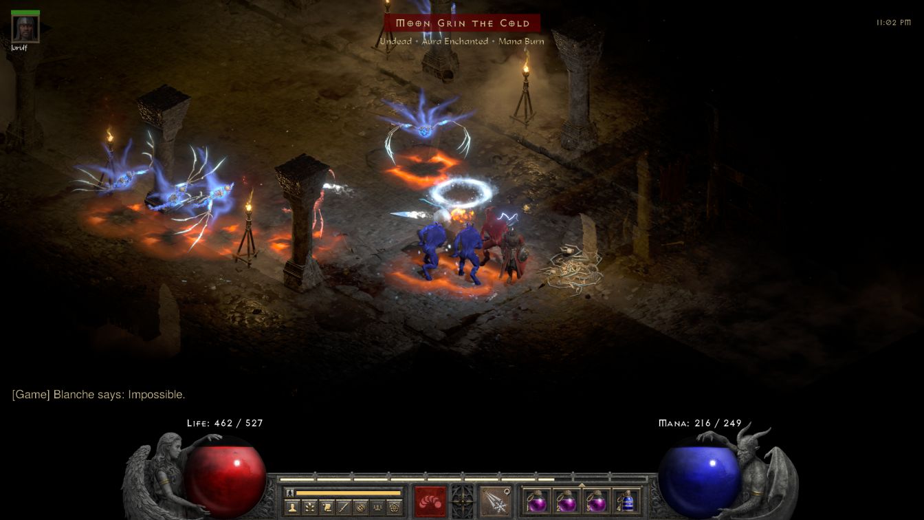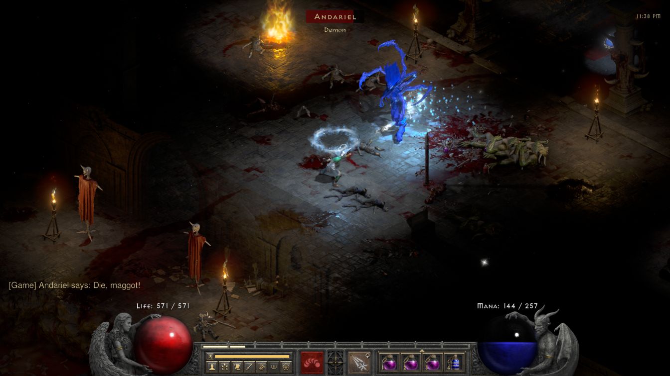 Act One has a lot of enemies with fire resistance... and almost nothing at all in the way of cold resistance until reaching Hell difficulty. I checked the stats at the Amazon Basin, and outside of certain pre-placed bosses like Blood Raven and Coldcrow, there isn't a single normal monster type with any cold resistance until hitting the Bone Warrior skeletons in the Pit. Every single normal critter before then had zero cold resistance whatsoever which left them easy prey for Blanche. Fallens had roughly 200-250 HP and would die in a single casting of Ice Bolt while most everything else sat in the 400-700 HP range and would typically die in two shots, sometimes three. Ice Bolt's cold damage type also helpfully shattered a good portion of the fallen corpses to deny the chance for their shamans to raise them, though Blanche was downing these enemies fast enough that it didn't matter much either way.