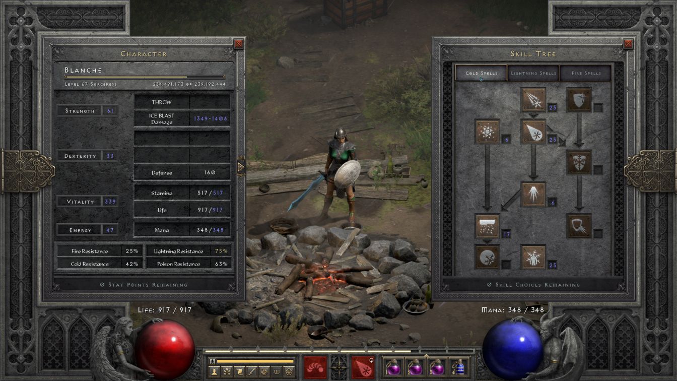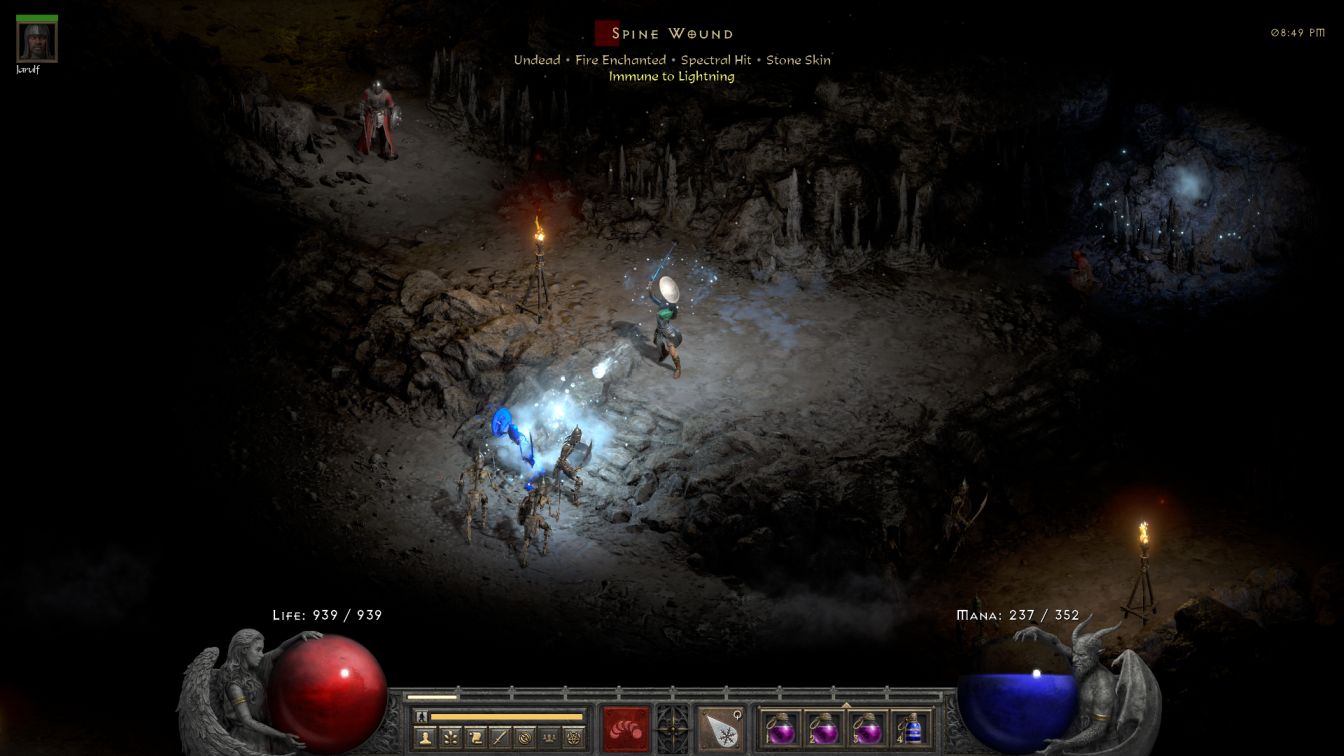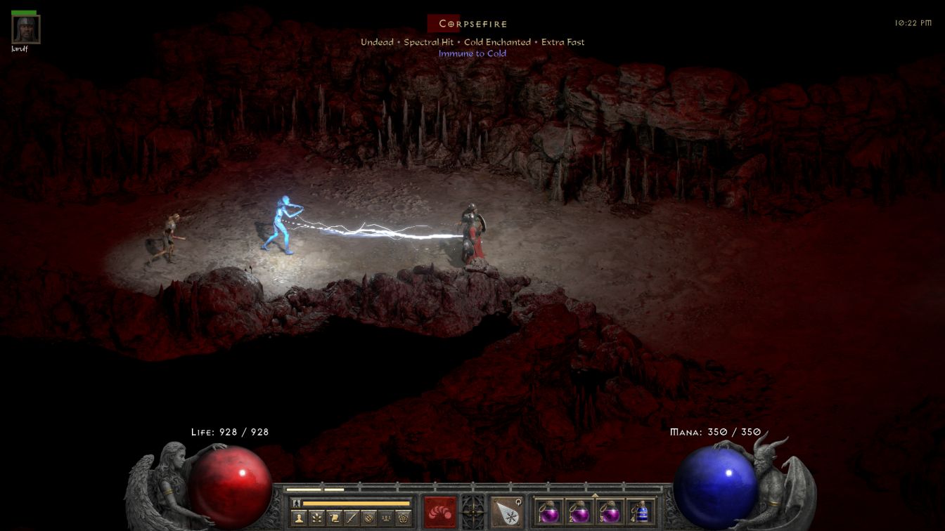 I had skipped over the Caves earlier and returned at the start of a new gaming session to clear out the underground caverns. There's exactly one enemy inside with cold immunity: Coldcrow, as everything else lacks the same protection. Blanche entertained herself blasting apart skeletons and corrupted rogues and fallens who had no protection against the freezing power of her Ice Blasts. On that note, Ice Blast innately freezes whatever it hits when it doesn't kill it outright, an incredibly useful property that's even better than the chilling effect of Ice Bolt. This also results in every single corpse shattering on defeat which completely removes the threat from fallen/shaman encounters. It was quite weird watching the little buggers shatter on every death and never get back up again, making it easy to walk in a straight line to the shamans and eliminate them as well. The ice Sorcie has one of the strongest character builds against this enemy type.