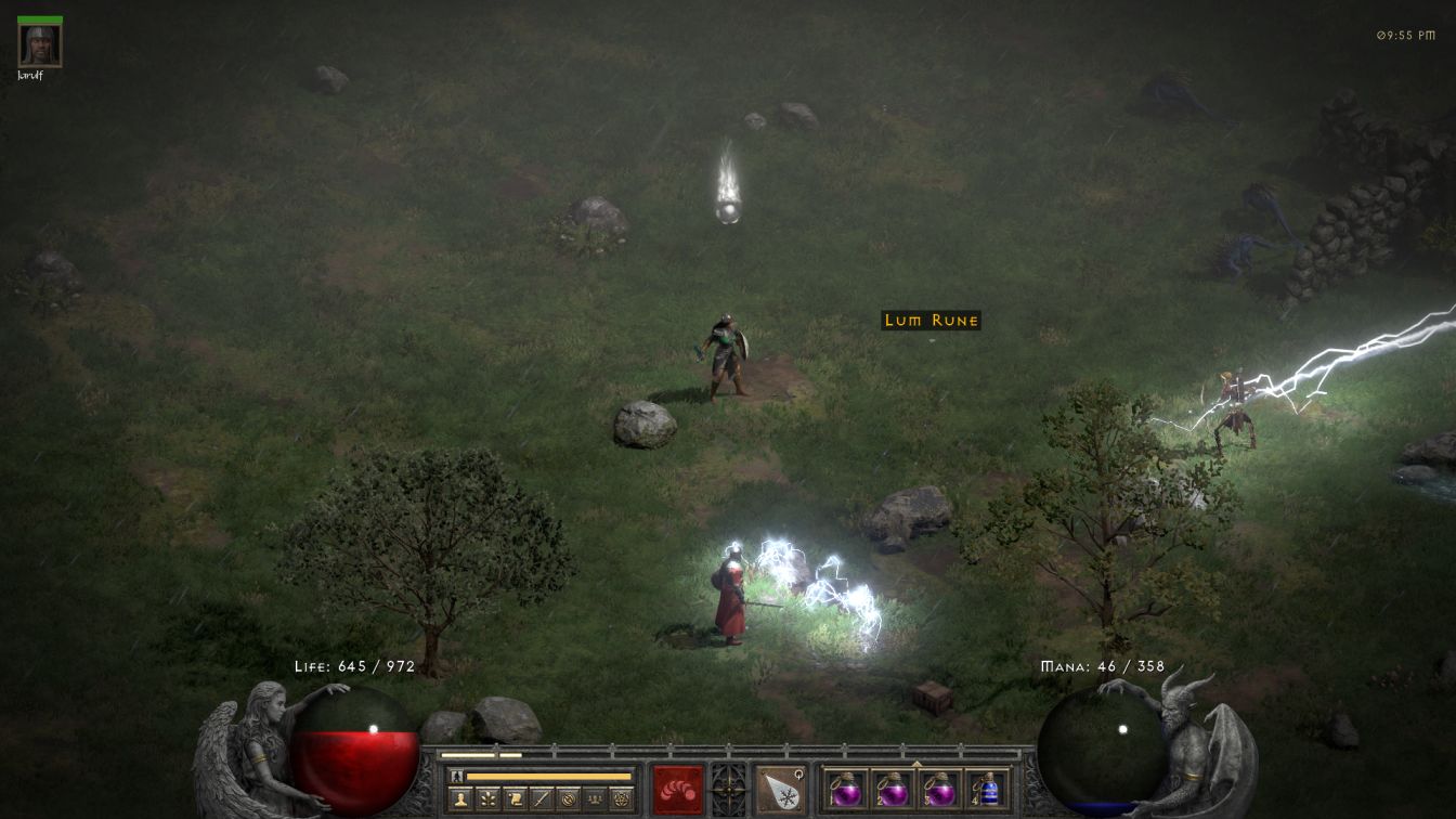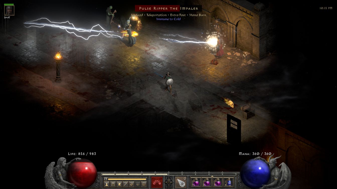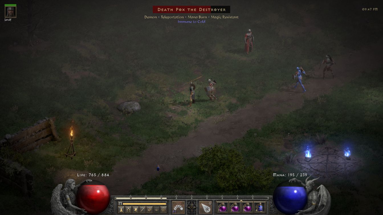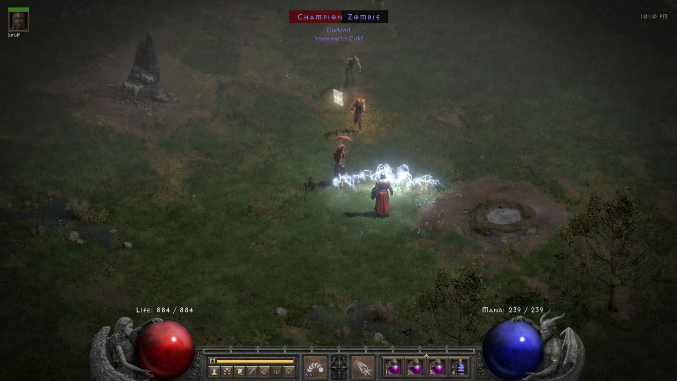 The biggest problem was that not everything was vulnerable to her spells. All enemies have at least one damage immunity in Hell and the zombies in the Blood Moor were all Cold Immune. Unfortunately Cold Mastery no longer breaks cold immunities as it did in earlier patches and therefore Blanche was stuck relying on Jarulf whenever they crossed paths with a zombie. This happened very frequently, of course, and Blanche would quickly kill everything that was not a zombie in mixed mobs, then swap over to her Prevent Monster Heal (PMH) javelins on weapon tab 2 and try to plug the shambling creatues with a hit to stop them from regenerating. While that wasn't really necessary for normal opponents, it's not like there was much else for Blanche to do. D2R has helpfully added an animation to show when a javelin or arrow misses the target, making it easier to tell when Blanche actually hit something with her dismal no-Dexterity 10% odds to attack successfully. Zombie bosses were tougher and against them the PMH javelins were legitimately worth using; I had to manage Jarulf carefully to keep him from suiciding by standing in place while spellcasting. This was a slow process but it did work to clear out the first area.