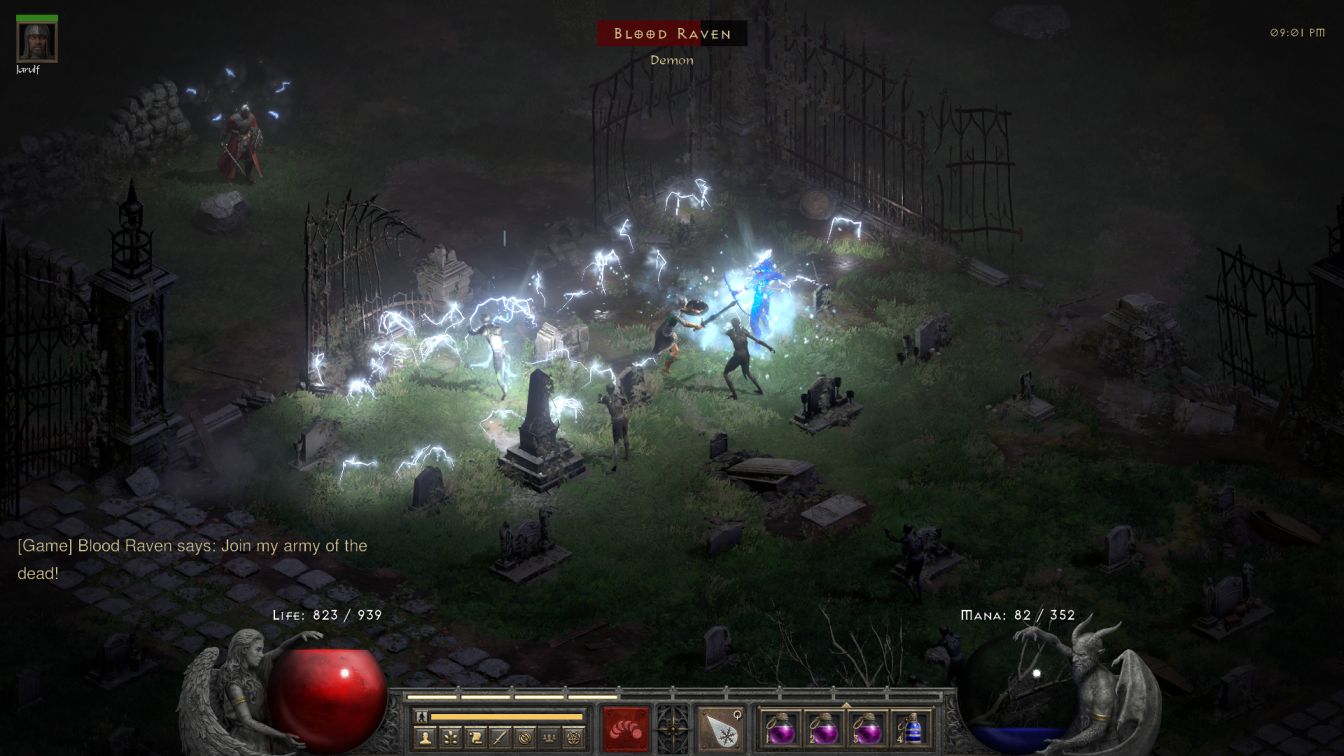 Then Blanche raced through the Cold Plains (which was full of monsters again by virtue of this being a new gaming session) over to the Burial Grounds, where she had to off several of the Cold Immune stragglers that had followed her through the gates. Blood Raven herself wasn't much of a threat since it was simple to stay ahead of her slow moving zombies. They didn't have any cold resistance and could have been defeated without issue, however they all die instantly when Blood Raven perishes so Blanche simply focused on the boss. Blood Raven runs around erratically and was a bit difficult to hit with Ice Blasts, eventually Blanche got the job done though (even if Jarulf foolishly walked into a bunch of zombies and died in the process). I'll also highlight the mana cost of Ice Blast: at 18 mana per cast and with a lot of fast casting gear, Blanche could run herself out of mana in a real hurry. That was never an issue with Ice Bolt because of its pitiful 3 mana casting cost but now I was back to juggling mana potions and frequently drinking blues off belt once again. It was another small thing that I had to manage as a player, though continuing to rely on Ice Bolt at this point would have been enervatingly slow.