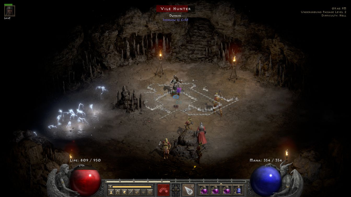 Blanche began Hell difficulty at CLVL 67 fresh off her victory against Nightmare Baal. I was largely pleased with how her character build was developing, based around lots of faster casting gear and a healthy +5 to all Cold skills thanks to the combination of Spirit and Lore runewords along with a recent Freezing amulet. The biggest shift for Hell difficulty was the introduction of the Ice Blast skill, which I had refrained from using due to variant rule on the first two difficulties. Ice Blast dealt vastly more damage than its little brother Ice Bolt, as the prior skill had been dealing around 300 base damage per shot whereas Ice Bolt was more than triple that total at about 1375 per casting. And that base damage was highly deceptive since Blanche had SLVL 20+5 Cold Mastery which reduced enemy cold resistance by 140%. Resistances can go negative in Diablo 2 which effectively increased damage up to about 3300 per Ice Blast against non-resistant targets. With Blanche spam-casting her spells and Ice Blast having no casting delay, her offensive output absolutely was not an issue. This was more than enough to be viable and even dominant in Hell difficulty.