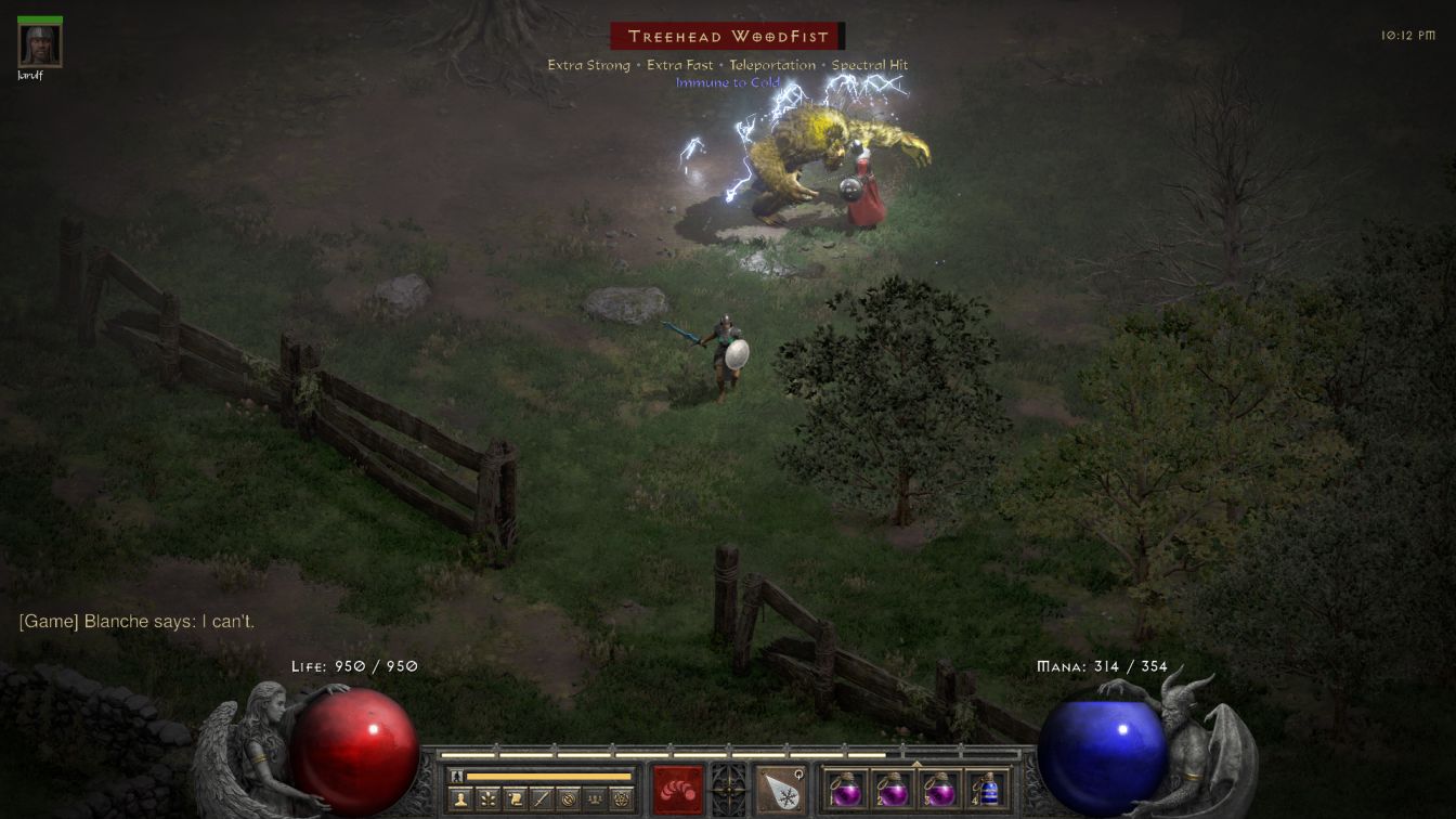 Treehead Woodfist was very much not easy or routine; he's always Extra Fast / Extra Strong and here in Hell difficulty he's also always Cold Immune. Despite my care, I experienced a bit of a jailbreak moment on approaching the Tree with all of the minions racing out towards Blanche. They massacred Jarulf and then I did my best to separate them with footwork with Blanche alone, then returned from the waypoint with mercenary in tow to start downing them with his lightning damage. This was hard stuff because of the Extra Fast on the Brutes, which made them so fast that Jarulf basically had to tank damage nonstop because he couldn't get away from them. It took some time to defeat all of the minions, with several more resurrection bills, and then Blanche still had to come back for Treehead himself who was an even stronger version of the same problem. I basically had to open a town portal, let Jarulf cast as many spells as he could get off before being redlined, then step through the portal to heal him at Akara and then come back again. We did this maybe eight times in a row before Jarulf managed to land the kill - thank you Prevent Monster Heal!