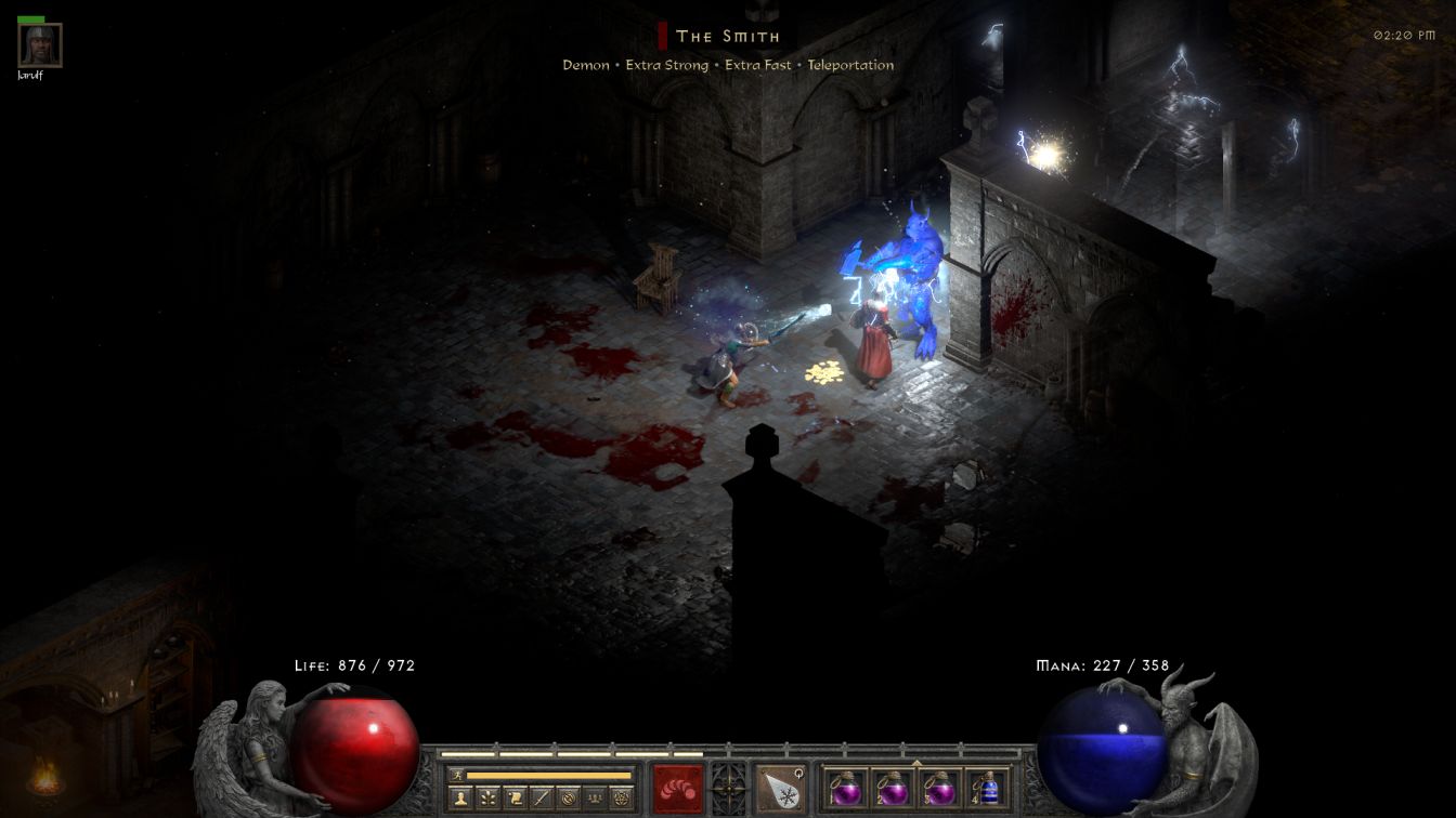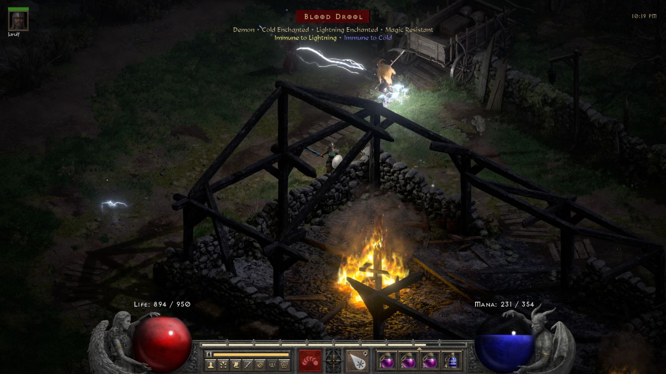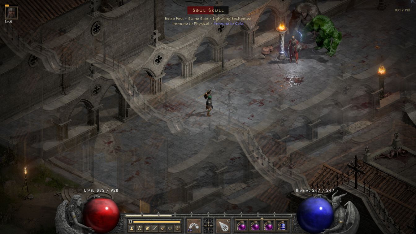 Cats 3 always has the same three monsters present with no variation: zombies, Afflicted demons who spit lightning, and then Banished vampires. It was that last group that caused headaches for Blanche because, you guessed it, they are always Cold Immune and there's no way to reroll the dungeon floor to get around them. If Blanche wanted to full clear this dungeon level, she had to eliminate all of these opponents with the help of her mercenary. The Banished are ugly customers as they have high health for this portion of the gameplay (about 8500 HP) and innate lifesteal whenever they deal damage to go along with the regeneration that all enemies get on Hell difficulty. Repeatedly, I watched them drop down to low health and then run away, only to come back a minute later with a full healthbar again. Blanche and Jarulf had to work hard to chase them down and get complete kills, a bit like how I remember having to herd the Zealots of Act Three with WillPower to control where their retreats would take them. Fortunately the gameplay seemed to treat the Banished as minibosses of a sort, generating them significantly less frequently than the zombies and Afflicted that made up the rest of the floor. The total number of Banished that Blanche had to deal with was relatively low.