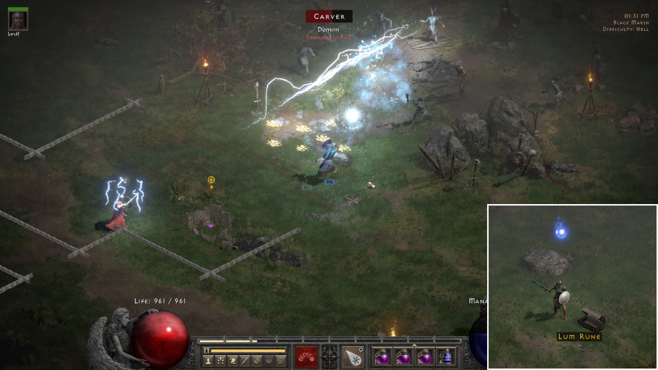 The Black Marsh was next and I had to reroll the area twice before I managed to get a monster draw without the Cold Immune Brutes being present. I had already proven that Blanche could full clear an area teeming with Cold Immune opponents if necessary, but why bother to spend 10x the time investment when she could simply fight non-immune enemies instead? While I'm quite willing to be patient at this game, there's a point at which you're just torturing yourself for no reason. After a few rerolls, Blanche was able to get a monster draw featuring crows and skeletons and the pictured Carver camp above. Then towards the end of the Marsh, Blanche opened a random treasure chest and found a Lum rune inside! I swear to anyone reading this that I wrote the introductory section above before Blanche found this particular rune; I write the reports as I play through each character's journey and I wasn't trying to foreshadow that Blanche was about to find that rune.