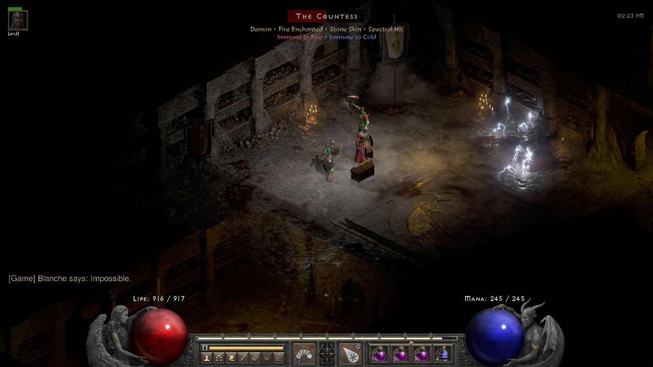 Most of the bottom floor was cleared by Blanche and Jarulf without issue. However, apparently the minions in the Countess' final room were a different type of corrupted rogue than the archers present everywhere else in the dungeon. These things were technically Dark Stalkers and, you guessed it, they were all Cold Immune. I was forced to lead them back to the large central room with the blood fountain where Jarulf had to kill them all with Lightning blasts and Charged Bolts. He died several times in this process since there were about ten of those minions in all. The danger was basically over by the time that the Countess alone remained, where once again Jarulf had to do all of the work against a Cold Immune target. The Countess dropped a pair of Ith runes for my troubles, then the quest treasure chest bugged out and failed to open entirely. I couldn't complain because Blanche had just gotten that Lum rune, but still, come on dude.