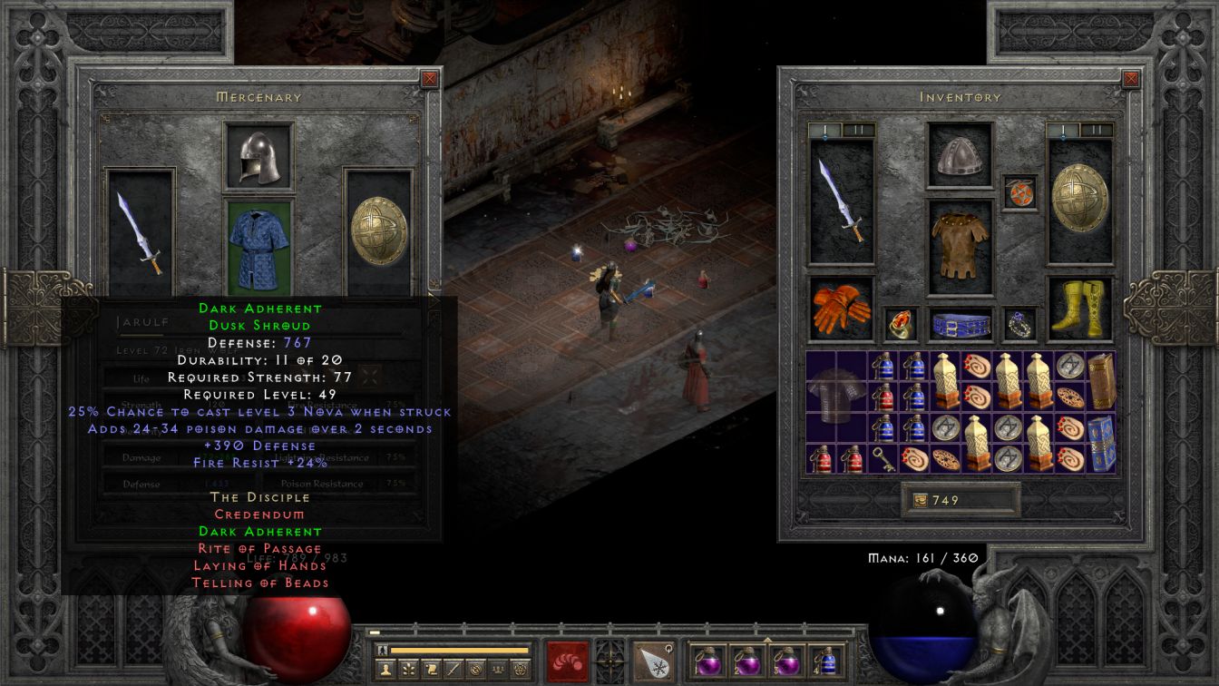 So Andariel chased after Blanche but her health just kind of ran out barely 10 seconds into this fight, if it can be called that. I cleared poison a second time from Blanche with another Antidote potion and even had a third one available to toss at Jarulf which kept him alive, hooray! I definitely had not been expecting the mercenary to survive. Andariel dropped Bloodfist, the unique heavy gloves (though unfortunately an ethereal version), which can be fun on other builds with its 10% faster attack speed and +40 life but didn't work for Blanche. She needed the resists that she was getting on her current gloves, plus the item had a Strength bonus which would be helpful later for equipping a Monarch shield. The ethereal property meant that this item was sale bait, as was an earlier drop of Iron Pelt (the unique trellised armor) which wasn't good enough even for the mercenary to wear.