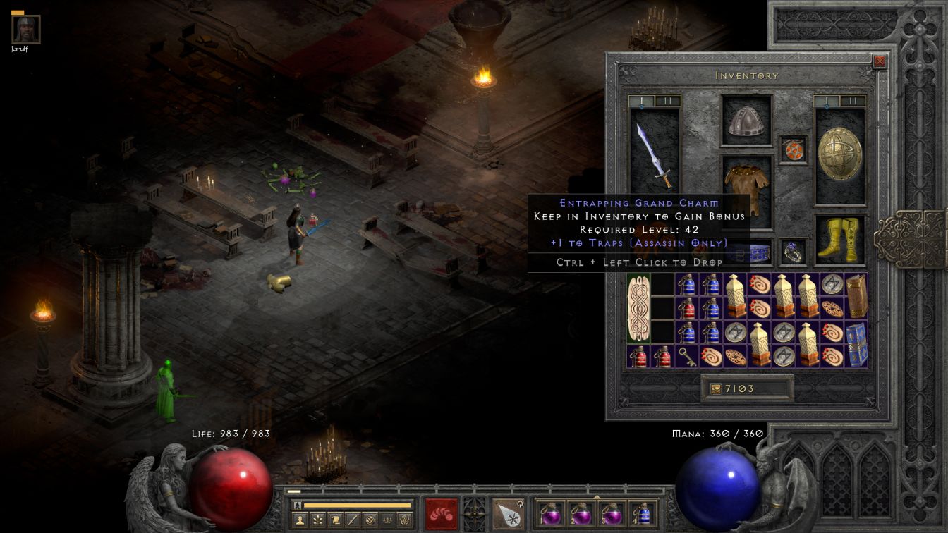 A fun set item randomly dropped and I decided to equip it on Jarulf: this was the Dark Adherent set dusk shroud which I largely gave him due to its big defense rating boost. The extra fire resistance raised Jarulf's resists high enough that I might try to upgrade from his three Diamond shield with 57% resist all; sadly he would never have enough Strength to equip a Spirit shield unless I gave him a helmet with +Strength on it (thereby locking out his Lore runeword) or Blanche reached some ridiculous character level in the 90s. Anyway, with progress to the Inner Cloister secured, Blanche and her trusty companion pushed on into the Cathedral. Bone Ash was Cold Immune, as always, however Blanche had overwhelming experience at dealing with those opponents by now. A single skeleton mage that required Jarulf's lightning bolts wasn't much of an issue. Bone Ash dropped a Grand Charm which turned out to have +1 to Assassin Traps on it, hmmmm. I've never played an Assassin before and the Traps version is the build that I would be most likely to use (since it's basically another spellcaster). This was another item that went into the shared stash and my running list of future D2 characters to play now had about seven different builds, heh.