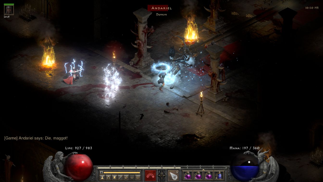 Cats 4 thankfully dropped anything with cold immunity from the monster mix. Blanche quickly cleared out the entry room by the blood pool, then shot down a zombie boss hiding right behind the double doors in the throne room. She eliminated some Dark Ones on either side, along with a second zombie boss, before Andariel finally woke up and came chasing after her. The Maiden of Anguish was also immune to being frozen and eagerly ran up into melee range while Blanche was spamming out Ice Blasts. In a fortunate coincidence, several Antidote potions had dropped in the previous room and I happily drank one down to clear the green coloring from Blanche when she was poisoned. I slid over to the right and kept pelting Andariel with Ice Blasts, noticing once again that her health was dropping quickly. While Andariel might have 66% cold resistance, Cold Mastery cut that to -75% which translated into Ice Blasts dealing about 2600 damage apiece. Andariel has 60k health which meant only about 25 Ice Blasts needed to land the kill - this might be a good time to remind the reader that Blanche could shoot about 3 Ice Blasts per second.