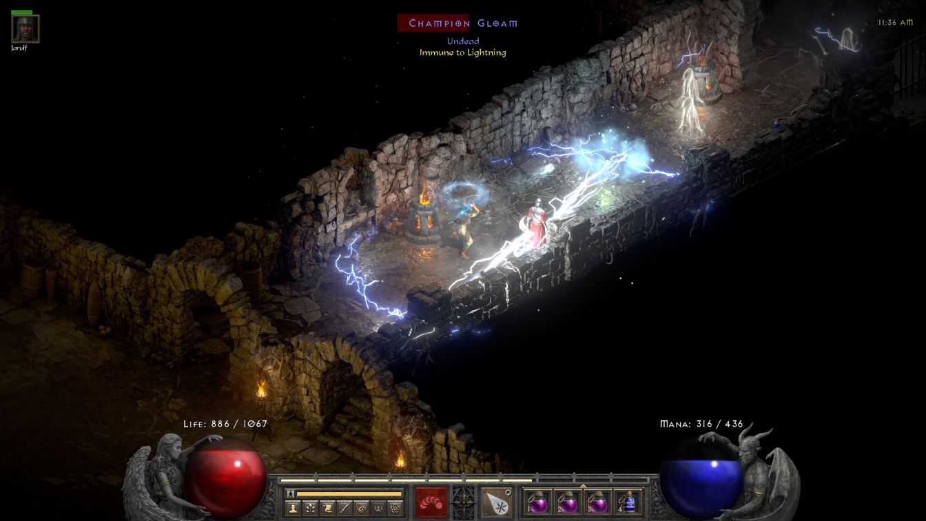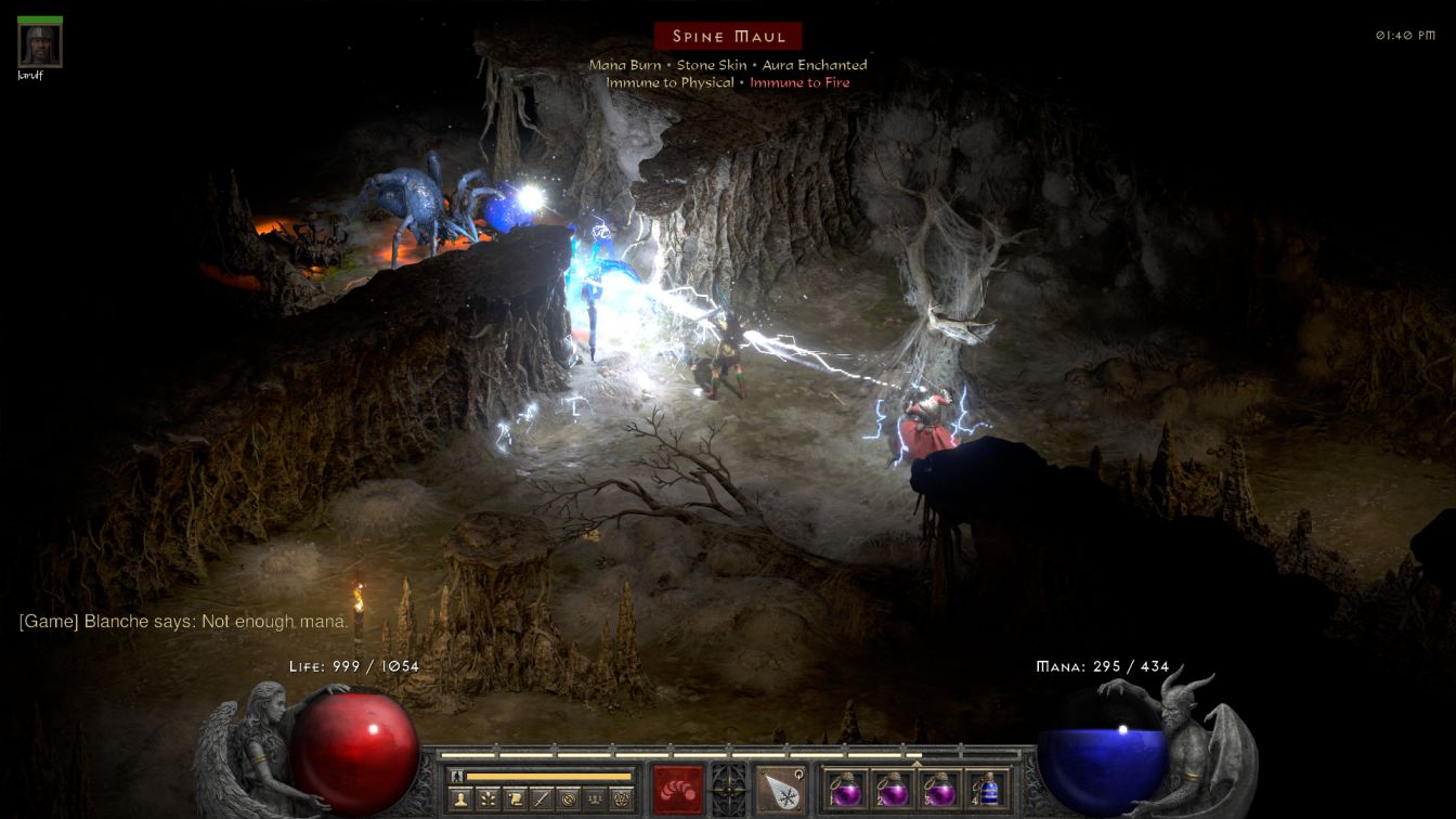 Now that I was warmed up as a player, I returned Blanche through the Flayer Jungle waypoint to tackle the Swampy Pit. This underground dungeon is completely optional and hardly anyone goes inside since the monsters are dangerous and there are far better places to hunt for rare item drops. I found that the Swampy Pit was just as crowded with bosses as the Flayer Dungeon had been, though fortunately this area had enemy types which were less scary overall. The first floor was full of Gloams which looked awesome as pictured above but weren't too bad for someone like Blanche who had maxed lightning resistance. There were also a bunch of Fiend bats which similarly lacked any cold resistance. The second floor had lots and lots of zombies (one of the least dangerous monster types in the whole game) along with even more bats. It is possible for the undead dolls to appear on these floors but thankfully Blanche didn't see any. Then the third floor was a big and empty maze that largely served to waste Blanche's time. All in all, things could have been much worse here and now Blanche was completely done with the jungles.