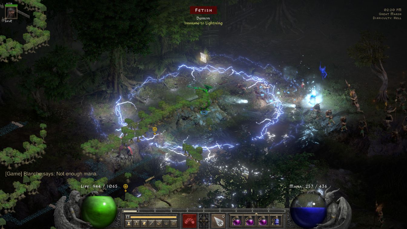 Most of this gaming session was spent hacking through the seemingly endless jungles that make up the first half of Act Three. Blanche full cleared the Spider Forest and then headed into the Great Marsh, which was located to the south of the first area and which I already knew would be a gigantic dead end. The Great Marsh was even heavier on fetishes with both the melee and blowdart versions, with a scattering of the swamp frogs as the only other monster present. This made for long, long marches through the swamps fighting off one group of fetishes after another. While each fetish was individually easy to kill, there were so many of them that Blanche inevitably took a good bit of damage from all of their little projectiles. Ice Blast could only hit one target at a time and I felt the lack of any area-of-effect damage here; Jarulf normally helped with that but continued to be useless as all of the fetishes were Lightning Immune. I also did have to watch out for the Inferno attack on the fetish shamans since Blanche only had 4% fire resistance with this setup and those flame tongues hurt a lot whenever Blanche was caught in one. On the plus side, Blanche found a Fal rune in the final Marsh alcove which was a nice souvenir to hold onto.
