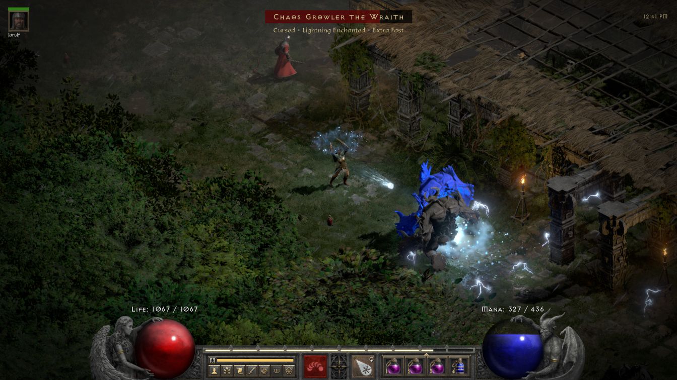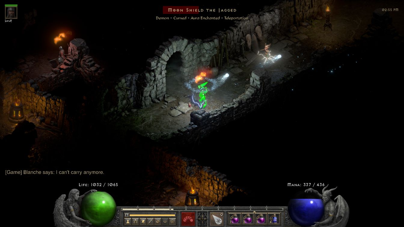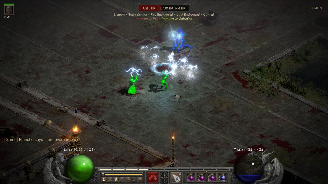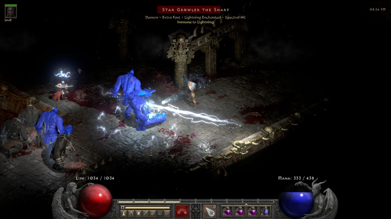 Upper Kurast proved to be similar to the Kurast Baazar, with the Thrashers back again to cause more annoyances. I initially exited the Sewers into the middle of Upper Kurast, only to stumble into a Cursed / Extra Fast Thrasher boss with its minions which forced Blanche to escape via town portal and then come back through the main entrance from the Kurast Baazar waypoint. There were two types of zealot enemies here, the actual Zealots who were Fire Immune and therefore irrelevant, and the Faithful who were innately Cold Immune and took a little more work. Again, this was all highly similar to the setup in the Kurast Baazar and Blanche handled it all without issue.
