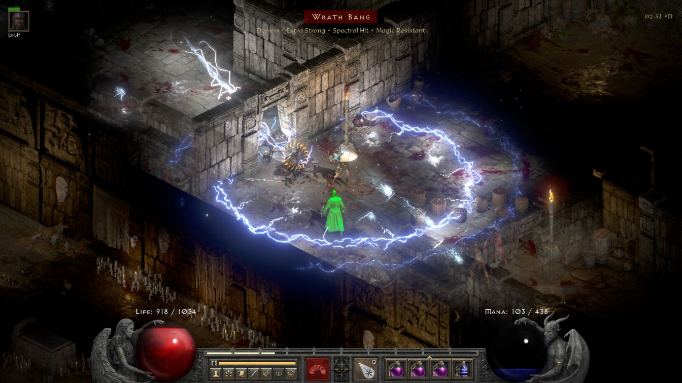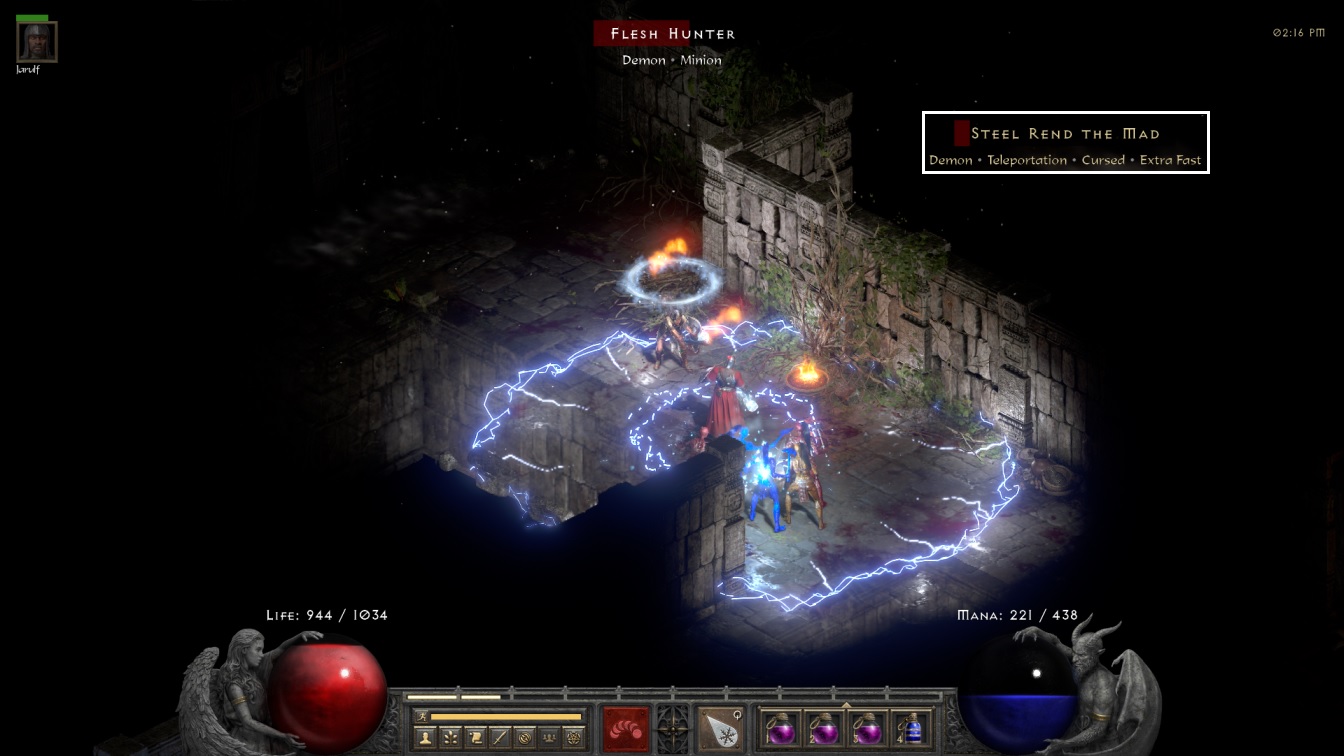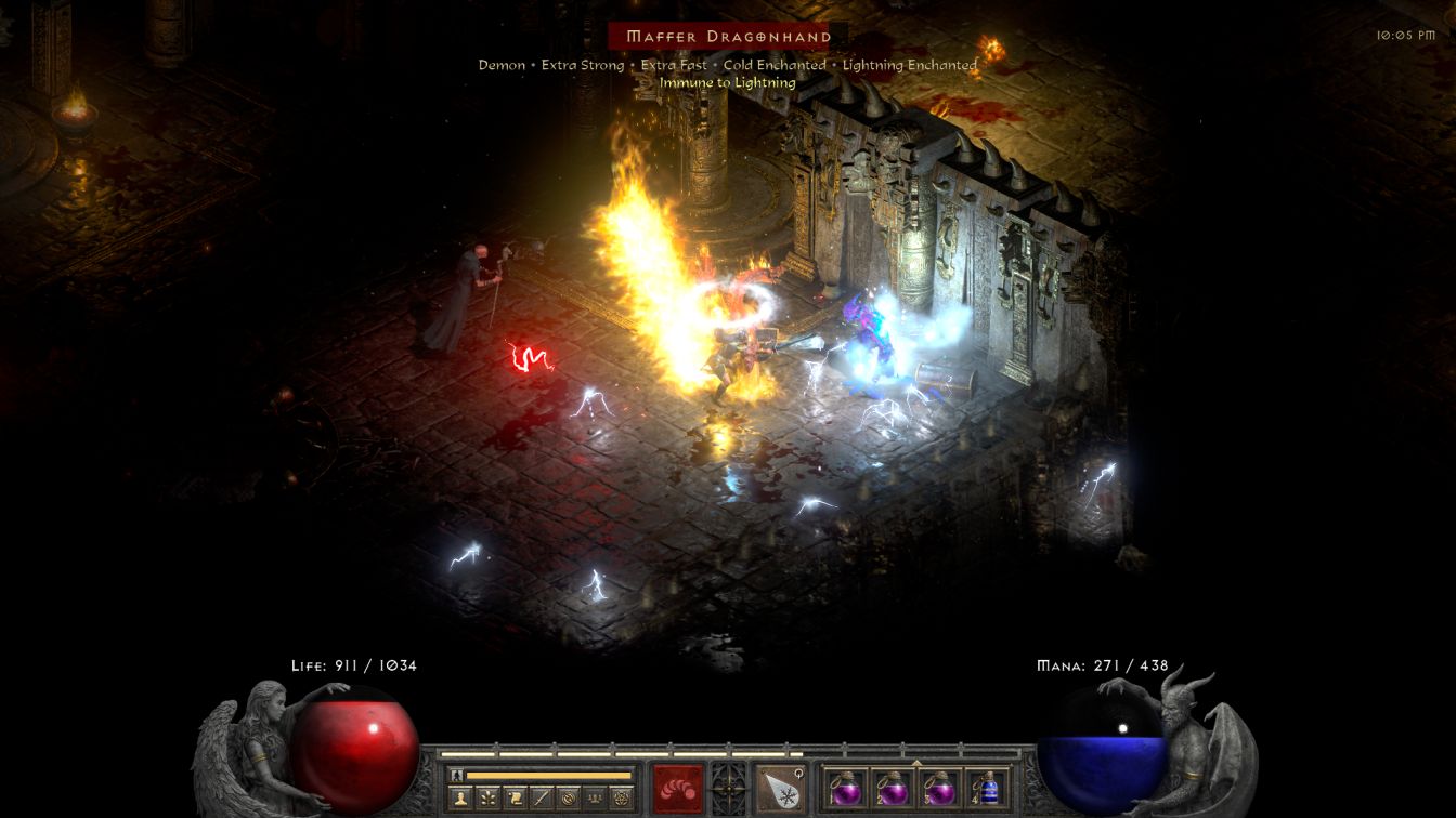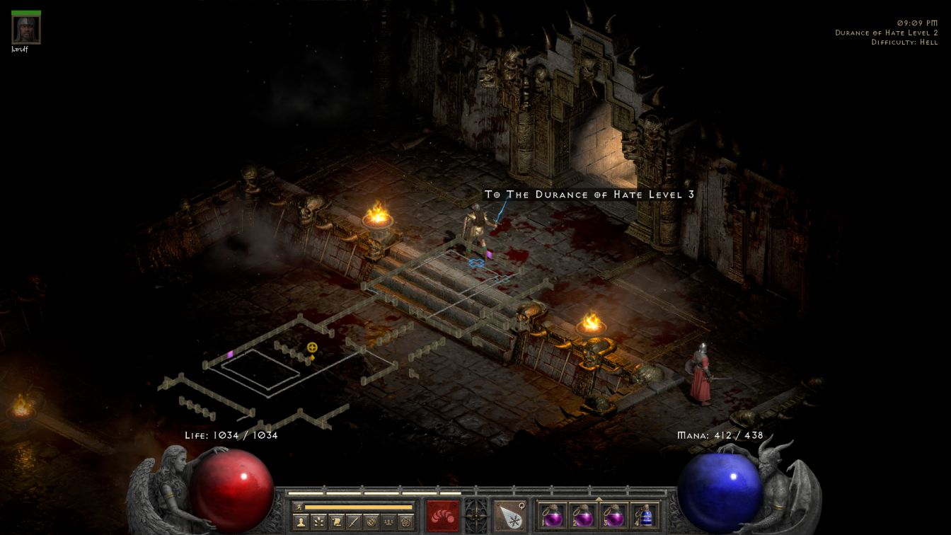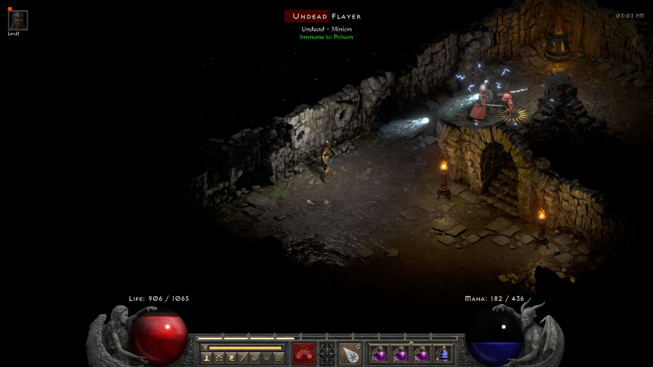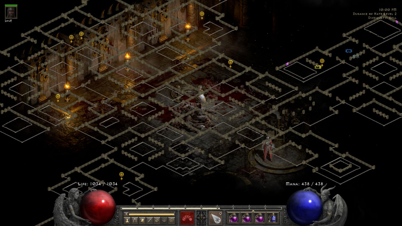 What an insane result from the map generation given the enormous size of this floor. The players who do endless Mephisto runs would absolutely kill for a setup like this, though they're playing on Battle.net and have to roll a new map for every game so they wouldn't be able to exploit it more than once. Anyway, Blanche was required by variant rule to full clear everything which meant she had an hour of hard work ahead of her. Unfortunately Durance 2 dropped the Maulers and replaced them with the undead dolls, who had announced their presence with a champion group fought in the previous room before even spotting the Durance 3 stairs. I didn't hate the undead dolls that much since they were at least easy to kill, falling in two shots apiece to Ice Blast despite possessing 75% cold resistance. Blanche simply had to remain on her toes at all times; I would carefully peek her head into each new room and wait to see if the dolls would come running out, and only then enter normally. She was usually able to run backwards and get them stuck on top of Jarulf where their death explosions didn't cause any harm. Unfortunately Blanche still did get caught occasionally and those death exposions were inflicting roughly 350 damage apiece. There was one moment about halfway through the Durance when two of them went off simultaneously and I was left with Blanche sitting on a life orb reading 150 HP remaining. There was nothing else near Blanche so she could safely stand in place and drink two red potions but sheeesh, that was too close for comfort!