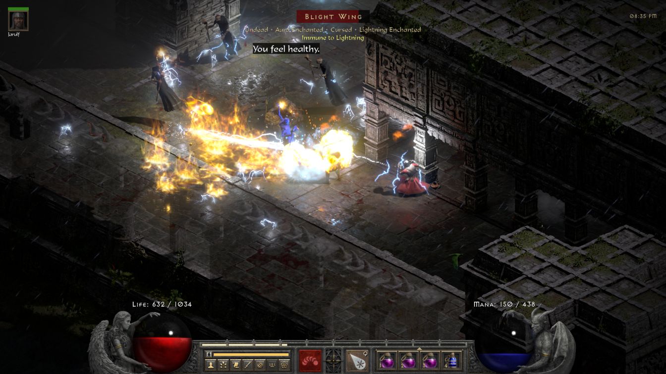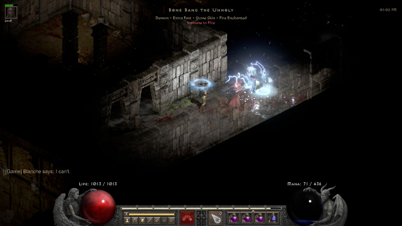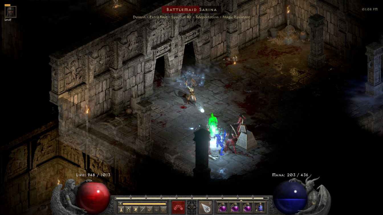 I genuinely do not like the Kurast Sewers due to their large size and the generally bleak environment that prevails down there. Blanche had a pretty good draw this time though, avoiding the undead exploding dolls and instead getting a bunch of mummies and bats along with the Horadrim Ancient / Horror skeleton combo. She was one character who didn't mind the greater mummies appearing and everything down in the smelly tunnels died pretty quickly. This is a large area and it took some time to full clear the whole place, which Blanche would have needed to do anyway since I didn't find the stairs down to Sewers 2 until the last possible moment. Icehawk Riftwing and his fellow bats guard the staircase down to the tiny second floor, posing a greater threat than normal since they were all Cold Immune and didn't take much damage from Ice Blast. I tried to draw them out from long range only to wake up Icehawk himself who was packing Cursed and Fire Enchanted for the extra two boss traits, not a great combo given that Blanche wasn't wearing her belt with extra fire resistance. The boss landed a couple quick bites and Blanche had to drink an emergency full rejuv, her health orb temporarily flashing near empty, before several more Ice Blasts finished the thing off. Most of the Sewers had been a snoozefest but not this last challenge!