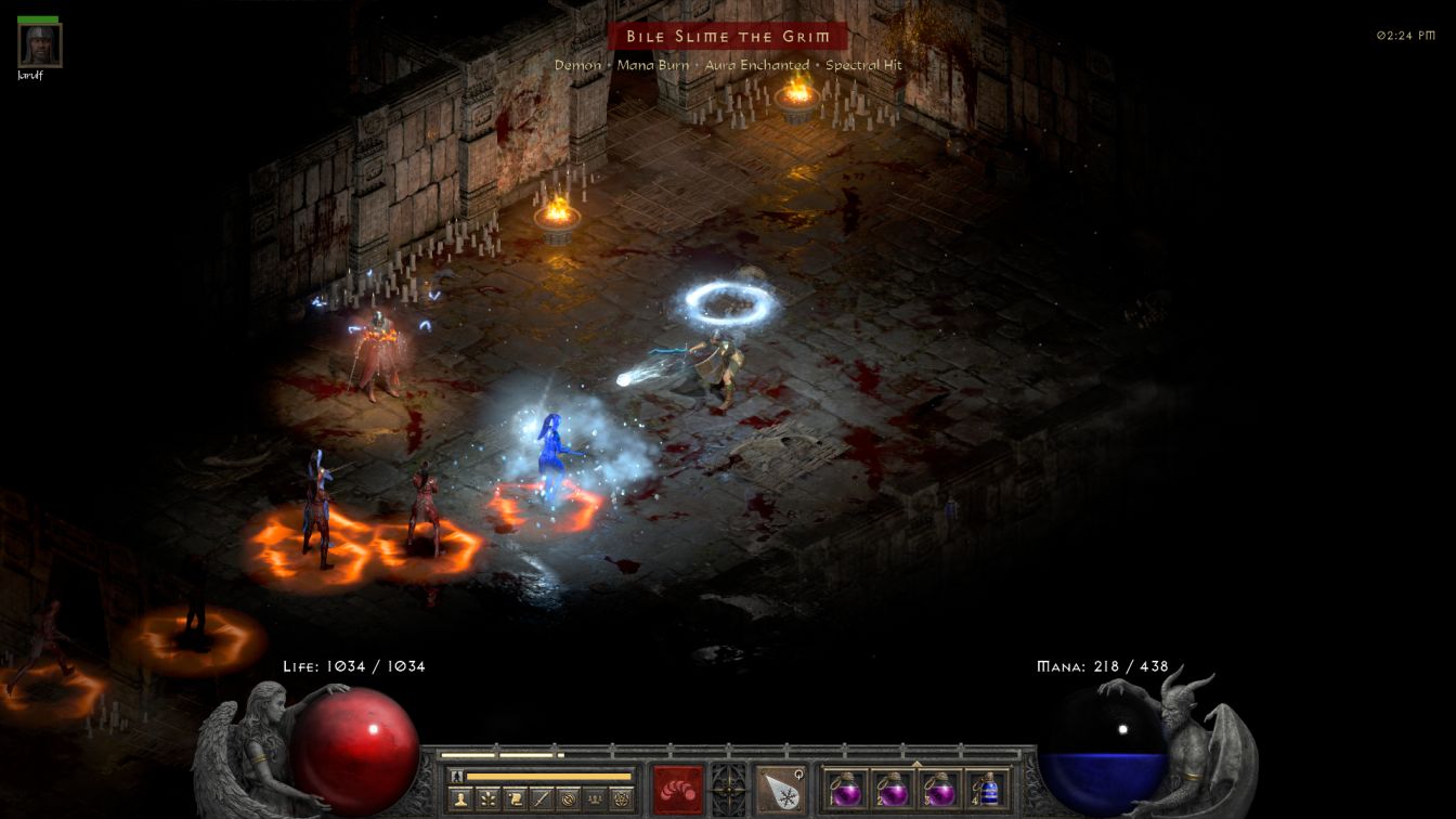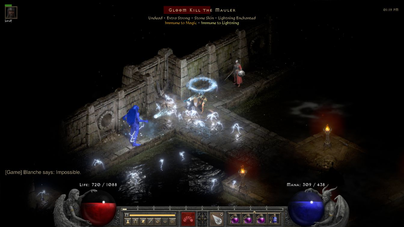 I also tend to enjoy the battles on Durance 3, though this time around the floor was hostile in the extreme and I would have a lot of work to do in order to complete Act Three. There was nothing at all in the initial room after coming down the stairs, only for Bremm and his minions and several vampires to all wake up at the same time when Blanche passed through the main gate. Bremm had rolled Cold Enchanted for one of his extra traits and I'm pretty sure that created a cold immunity as he took a ton of shots to defeat. There were frankly too many enemies on screen at the same time and Blanche had to spend some time running around in circles as she first cut down Bremm's minions (who were not Cold Immune) followed by whittling down Bremm himself. At least the boss aura had been Holy Shock which wasn't very dangerous.