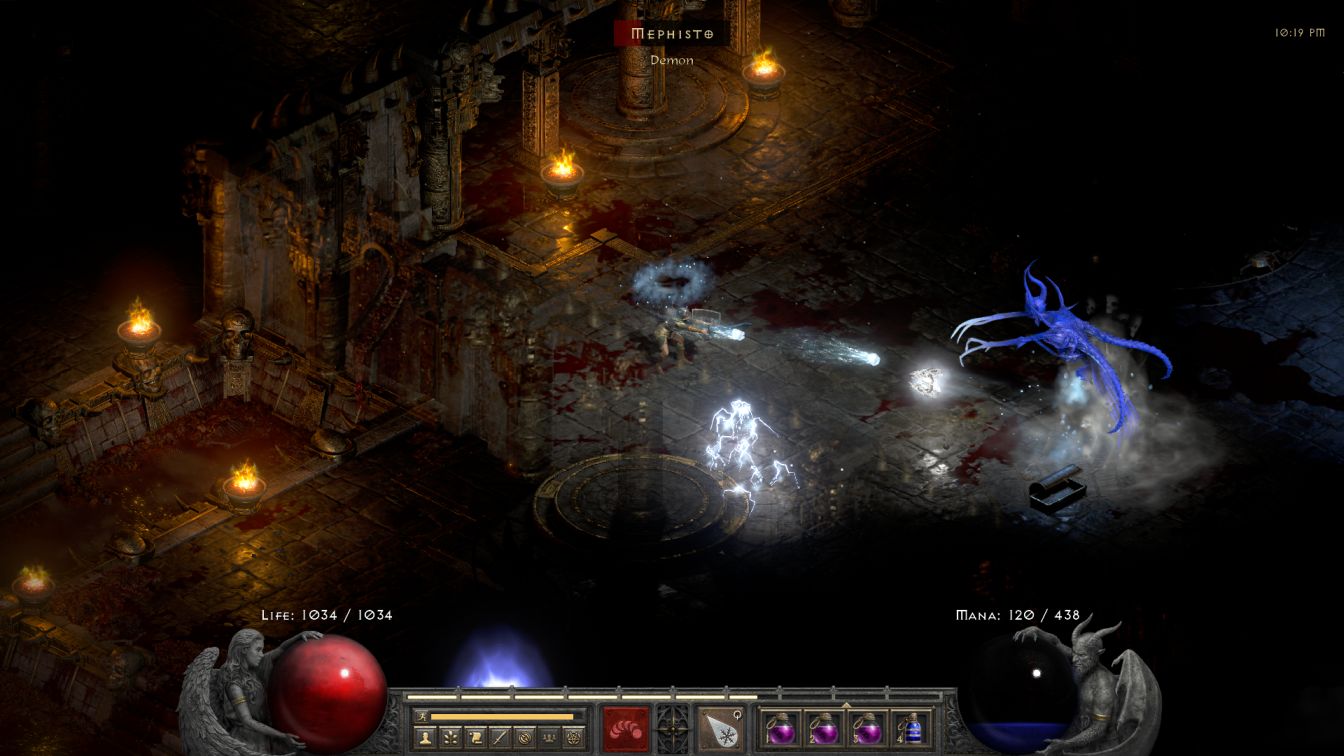 With everything else slain, Blanche could now activate Mephisto and pull him over to Wyand's emptied space where there was ample room for dodging. Mephisto was not Cold Immune and therefore took heavy damage from Blanche's Ice Blasts, about 3500 damage per shot, which didn't take too many hits to achieve victory despite Mephisto's 94k healthbar. However, what I hadn't been expecting was how much damage Mephisto would deal with his own spellcasts. Blanche only had 30% cold resistance and the Lord of Hatred's cold shot hit her for roughly 300 damage when it landed. Mephisto also used his Blizzard spell at one point and it instantly dropped Blanche's health to 450 HP before she could run out of its radius, yikes. So this was an offensive showcase on both sides and I had to drink yet another full rejuv during the fight because I did not want to suffer a stupid death here after everything Blanche had fought her way through. The fight was short, barely a minute long, but way more tense than it had any right to be. Blanche landed a few final Ice Blasts and watched with satisfaction as Mephisto collapsed into flame: