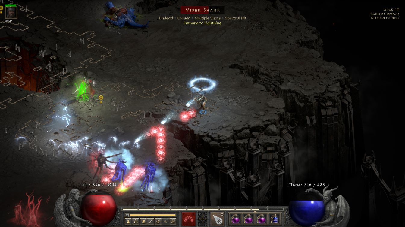 The Plains of Despair kept the Corpulents while rotating in two fresh faces: Burning Soul gloams and Doom Caster finger mages. This created an area where most of the opposition was ranged in nature, though the finger mages were mostly irrelevant while the Burning Souls were potentially deadly. Those invisible things were the definition of a glass cannon threat, dying in one or two casts of Ice Blast while also dealing heavy damage in the process. It was almost impossible to avoid their Lightning attacks given the speed of the projectile and the way that the monsters shot them while invisible. They hurt a lot even with Blanche's maxed lightning resistance and I can recall many deaths taking place when I brought team variants through this place and players were caught unaware of the threat. Nevertheless, I still preferred this monster draw to rolling any of the spawning creatures who would have dragged out the time commitment. Izual appeared about two-thirds of the way through the Plains and died really fast, barely lasting longer than a Corpulent boss. We had come a long way from Normal difficulty where he was a beefy tank that took several minutes to knock down.