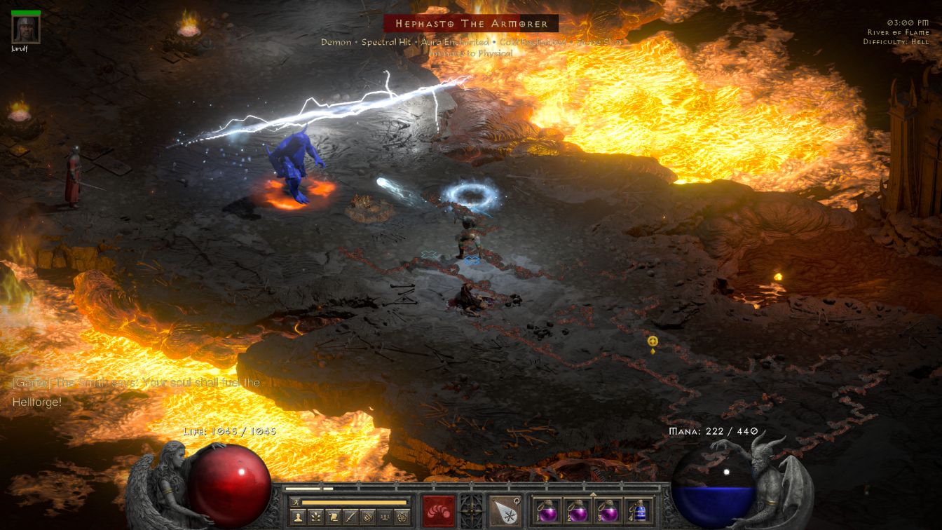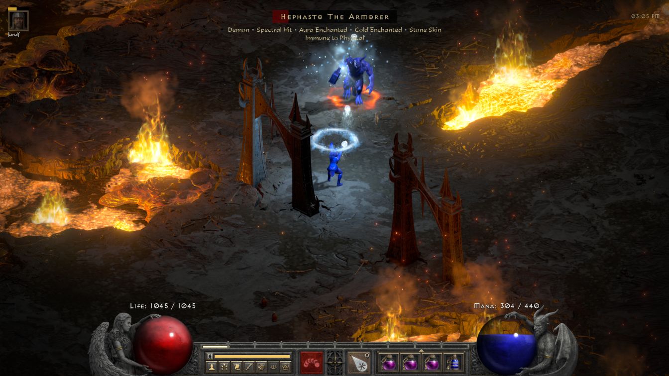 It didn't take took long to find the Hellforge area along the usual side branch of the River architecture. Blanche was able to draw out a whole bunch of Urdars followed by Hephasto who she was able to confront by himself. The forge demon rolled a Fanaticism aura which was pretty scary, though his additional two traits of Cold Enchanted and Stone Skin didn't look that bad. Hephasto began by chasing after Blanche for quite some time, totally ignoring Jarulf in the process for whatever reason. Blanche was able to chill him right away and then I began kiting backwards across the cleared expanse of the River. Hmmm, I was hitting Hephasto a lot without killing him, in fact his healthbar was barely decreasing. Eventually he turned and swatted down Jarulf in two hits which was a bit concerning. Now the demon continued his pursuit of Blanche, taking advantage of his Fanaticism aura and the fact that Hephasto gets faster as his health decreases, until he was close enough to smack Blanche with his hammer. That's when I discovered two unpleasant facts. First, Hephasto's melee attack really, really hurt; Blanche's health orb dropped to 500-something HP and I immediately began drinking a red potion for recovery. The second realization was the fact that Hephasto chilled with his attack... which now made him faster than Blanche... which meant that she couldn't get away. A second hammer blow descended and that was that: