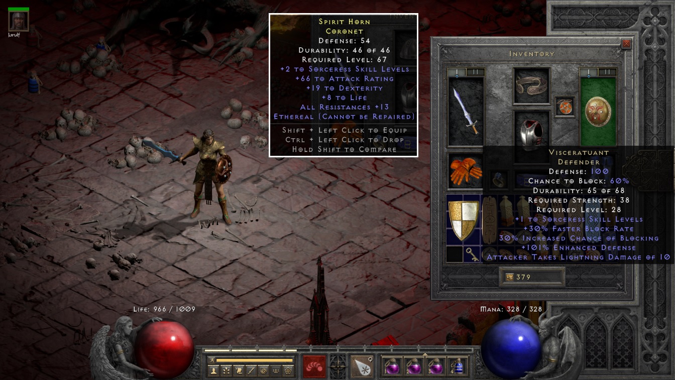He dropped a Burning Essence of Terror (something I'm still not exactly sure what to do with), four rare items, and the unique Defender shield. That was Visceratuant, an item that I'd never seen before, which had a bunch of defensive modifiers along with +1 Sorceress skill levels! It was pretty amusing that this dropped specifically for Blanche and with a Strength requirement of only 38, I did think about going back to reset her stats and place an additional 100 points into Vitality. But no, there were too many good stats on Blanche's current Spirit shield to make swapping worthwhile, since it provided +2 skills instead of +1 skills along with extra resistances and 33% faster cast. It's another good example of how the Spirit runeword is too powerful and crowds out virtually all other competing options. I did snap this zoomed-in screenshot of Blanche wearing the shield since it looked pretty cool though.