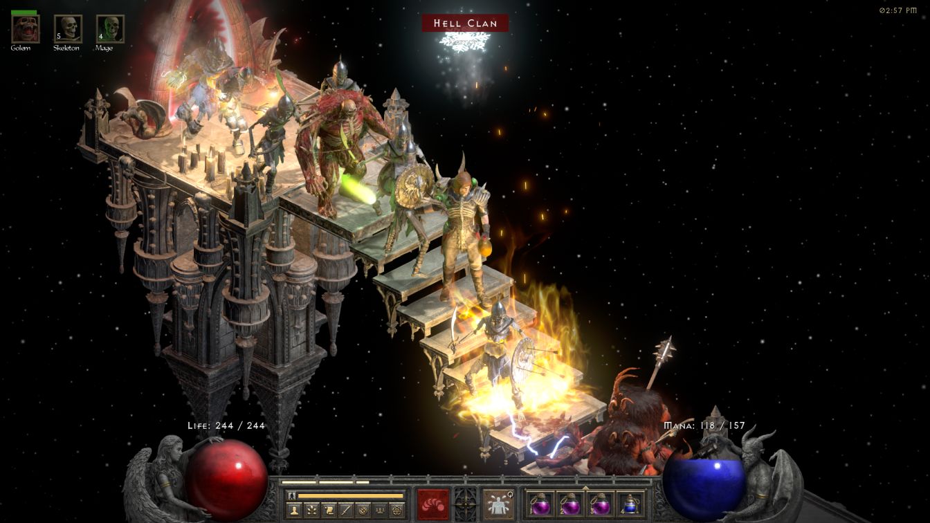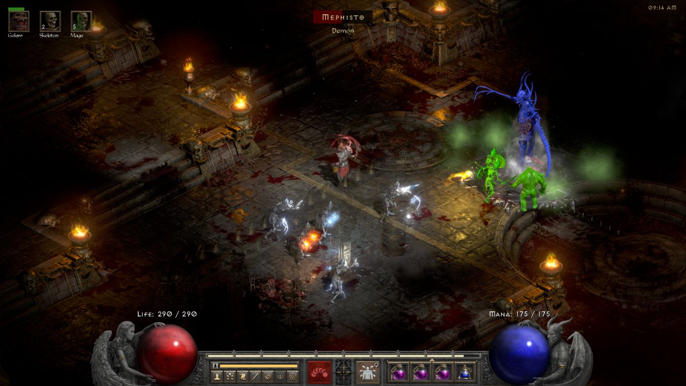 For the moment though, it had to be the Blood Golem for use against Mephisto. I knew that the skeletal warriors would never survive this battle since the demon lord constantly sends out a cloud of poisonous gas against nearby threats. All of the skeletal warriors turned green and they lasted for about half of Mephisto's healthbar before collapsing, which was honestly more than I'd been expecting. Then it was down to the golem to tank while the ranged skeletons shot down Mephisto from afar. The Blood Golem would die in two hits which was plenty long enough for Skelly to keep raising more of them as they distracted the Prime Evil from focusing the mages. This was a really fun fight to play out and I was successfully able to keep Mephisto focused on the golem; he launched one lightning bolt that fried an individual mage but the other four kept shooting and got the job done.