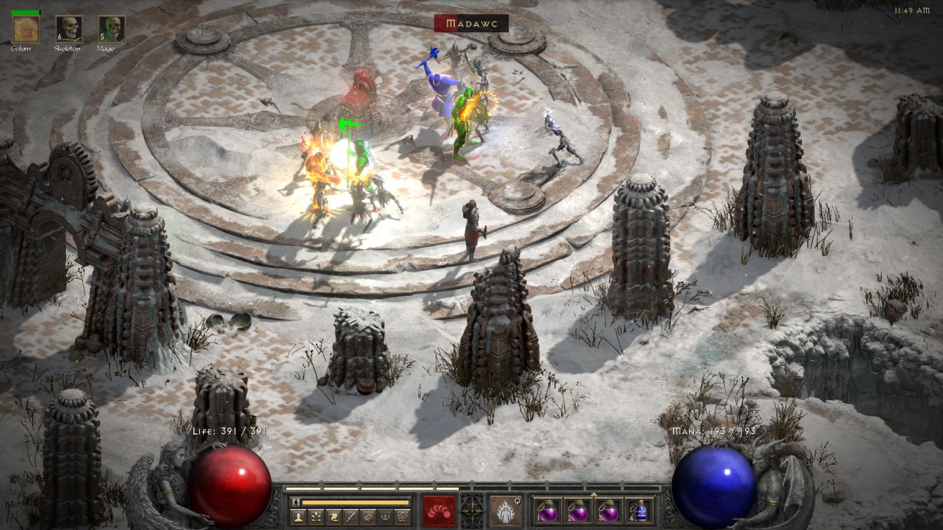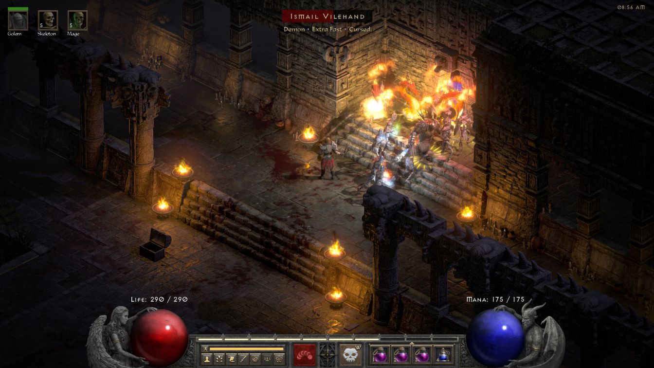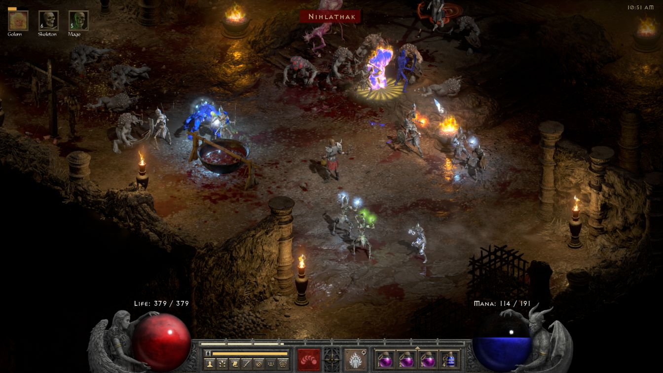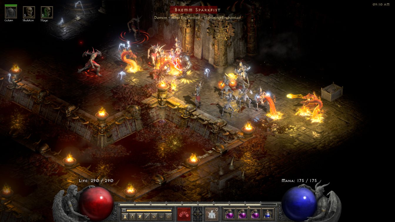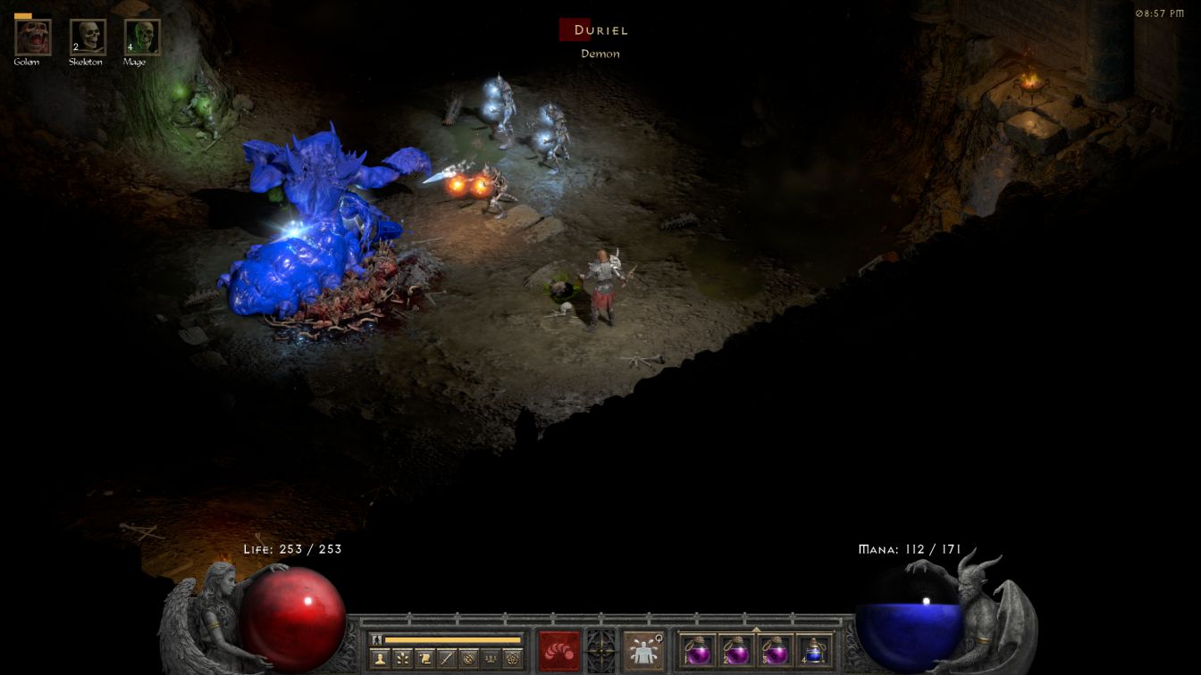 The first two floors of the Durance were uneventful, with the skeletons again obliterating everything in their path. Durance 3 dialed up the challenge level, as always, when Bremm and his minions spawned on the right side of the central blood pool with a Blessed Aim aura. There were so many sparks flying around from his Lightning Enchanted status that the Iron Golem was unable to handle the sitation and collapsed into a pile of metal. This was the last straw for me and I switched back to the use of a Blood Golem, casting the sack of flesh behind Bremm to distract him while the remaining skeletons finished cleaning up the rest of the fight. I really wanted to like the Iron Golem because it has such a neat concept but the skill simply wasn't the right fit for Skelly. I had even planned on running Iron Golem as the primary golem for this character, only to discover that the skill was heavily nerfed in D2R when they changed its Thorns aura from reflecting a percentage of damage dealt to flat damage returned. Reflecting back 200-300 physical damage per hit wasn't going to get the job done in Hell difficulty and therefore Skelly would be using a different golem as he advanced further into the game.