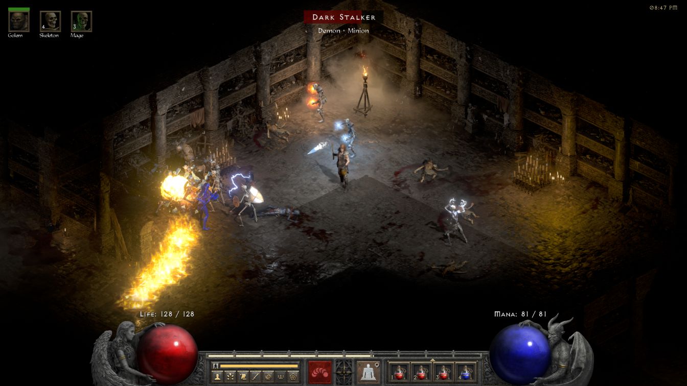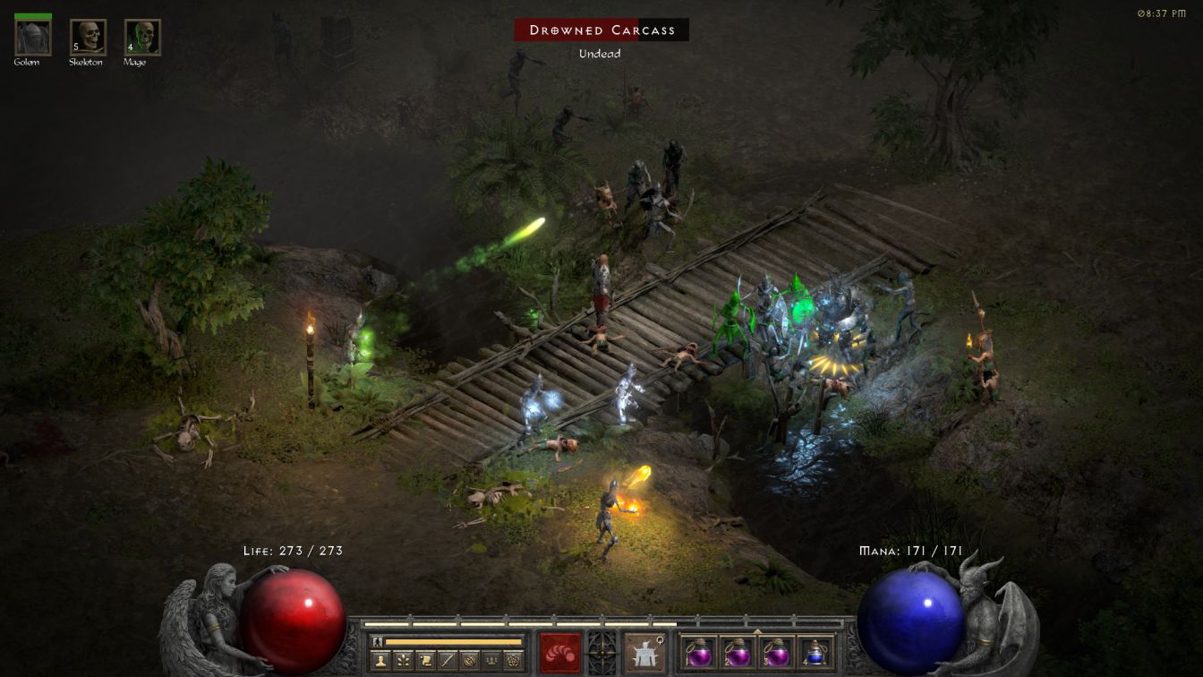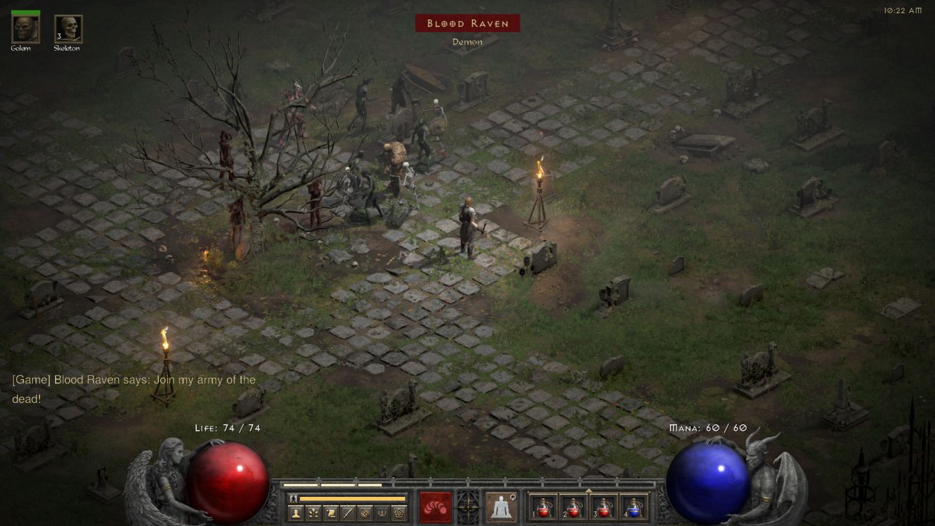 So what did this look like in practice? With the new Graverobber's Wand in hand, Skelly had effective skills levels of SLVL 10 in Skeleton Mastery, SLVL 9 in Raise Skeleton, and SLVL 6 in Raise Skeletal Mage. This allowed him to summon 5 melee skeletons and 4 skeletal mages, plus the Blood Golem which also benefited from the extra level in its own skill and Golem Mastery. The ranged skeletons had 159 HP each and their various projectiles averaged out to about 21-22 damage while the higher level melee skeletons had 164 HP and slightly higher damage. (Yes, the skeletal mages actually had higher health here in Normal difficulty than the melee skeletons after a patch change in D2R, and no, it doesn't make a lot of sense.)
