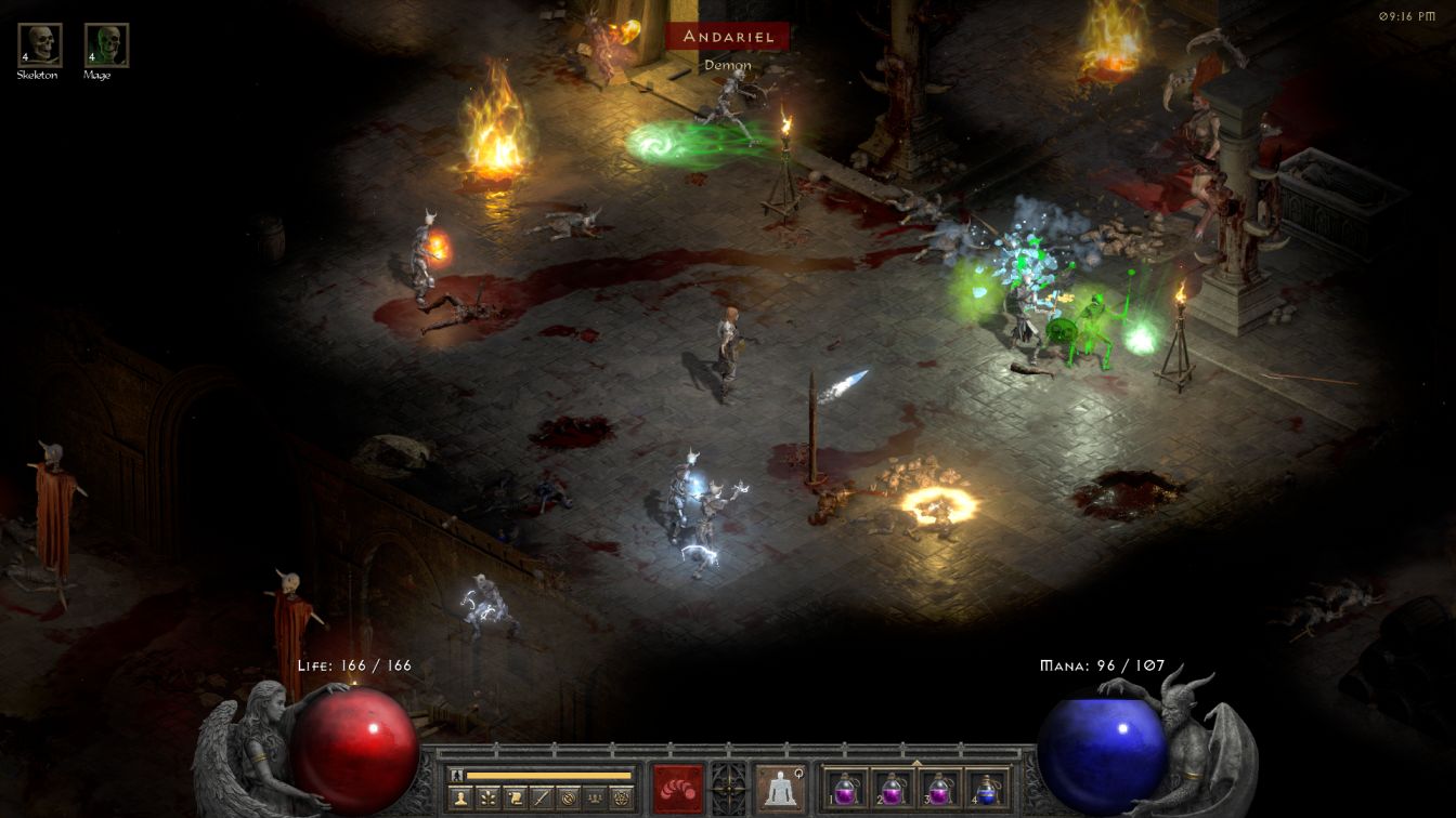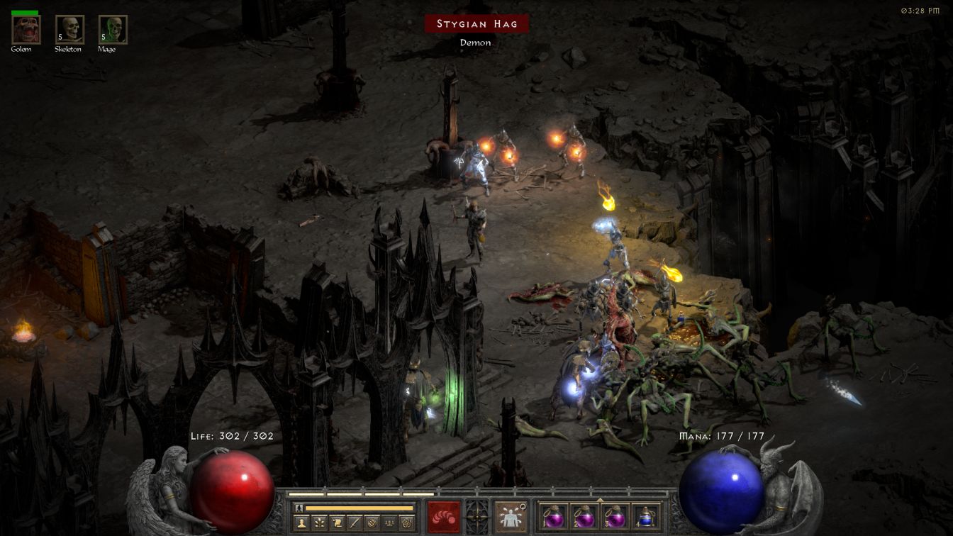 As far as Act Two was concerned, most of it passed by at breakneck speed with the enemies barely registering for Skelly. The Maggot Lair stood out due to its absurdly narrow corridors which prevented most of the skeletons from getting into the action. It could have been worse though: early in on Diablo 2's history, the Necromancer couldn't walk through the skeleton minions and you could get trapped by your own skeleton army down there (which happened to Sirian on his original Skeletorr character). Even with this no longer being the case, there were way too many situations where Skelly only had the golem and one or two skeletons doing the fighting, which was fine for Normal difficulty but would cause problems when coming back here later. I will say that the Blood Golem was quite strong for this point in the gameplay, dealing legitimate damage in its own right and also healing back Skelly in the process. I noticed a bunch of times where Skelly took random chip damage only to see him pop right back to full health thanks to the efforts of that life link.