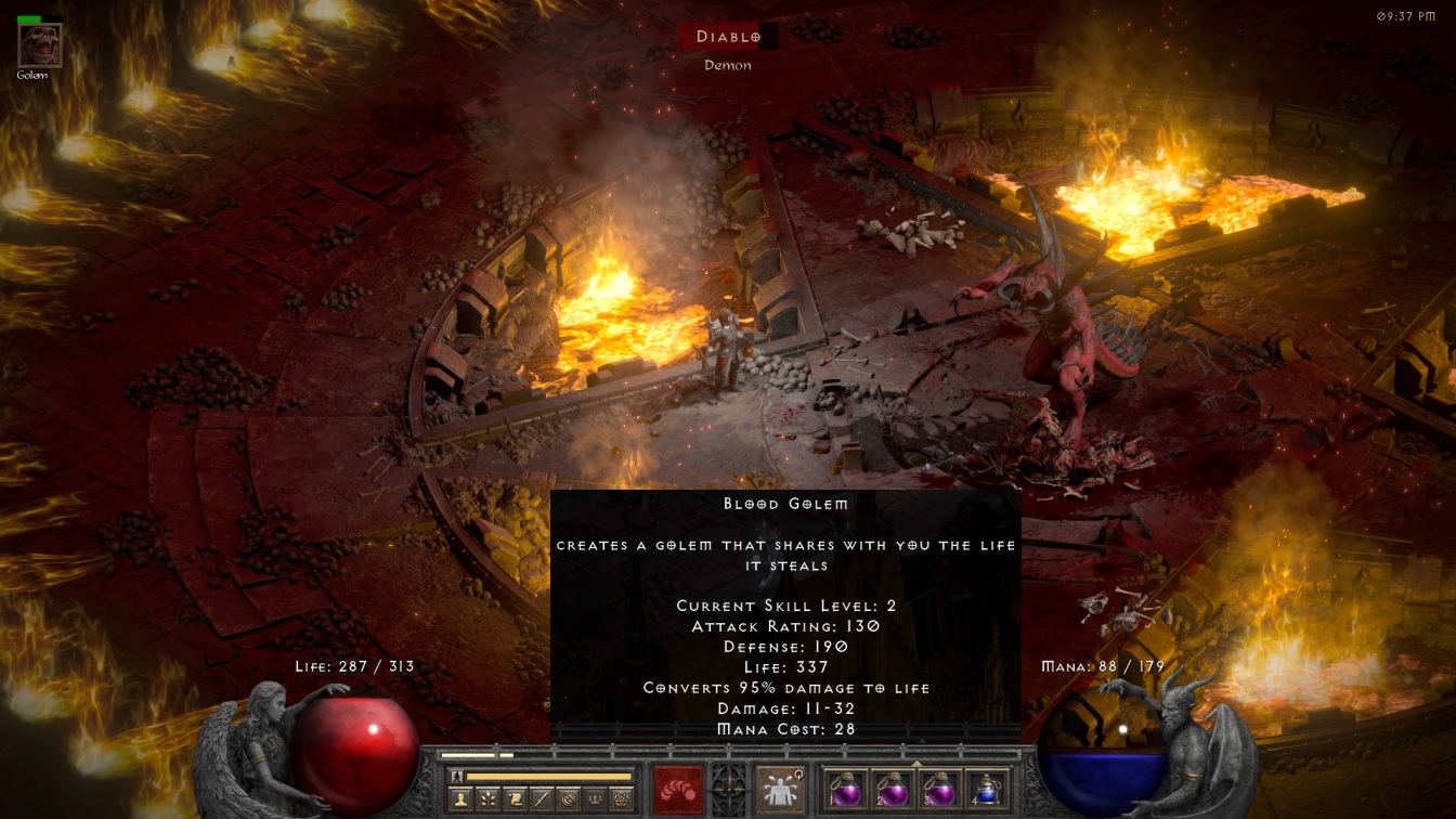 I tried my best to use the Blood Golem to deal the remaining damage to Diablo but the process was a bit like trying to cut down a tree with a toothpick. The golem died incredibly fast to Diablo's physical attacks as well as his fiery abilities. Diablo kept freezing the golem with his melee attack which would lock the thing in place until Diablo shattered it with another blow. The poor golem would also die instantly to the Lightning Breath of Doom and the lifespan of these things was measured in mere seconds. When the Blood Golem did managed to land its own attack, it did a whole 11-32 damage per hit. Ummm.... Diablo has 13,800 HP in Normal difficulty and the skeleton army had maybe removed 20% of that before kicking the bucket. I tried swapping over to the Iron Golem in desperation but that was no better, with the iron version of the summon surviving no longer and inflicting a whopping 70 reflected damage via its Thorns aura each time it was struck. Maybe it would have been possible to use the Iron Golem if it didn't require a new metal weapon to be summoned each time, but with that restriction this clearly wasn't going to happen.