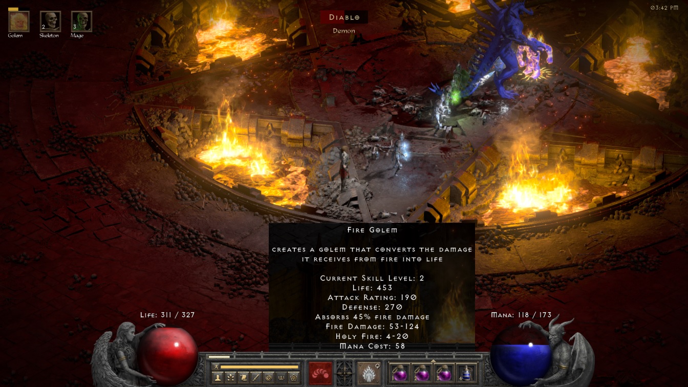 Then it was time for the rematch against Diablo with the shiny new Fire Golem in tow. I pasted in the stats of the two golem skills in the last two pictures above for comparison, as the Fire Golem outclassed the Blood Golem in every single respect. Quite aside from having about a third more total health, the Fire Golem also absorbed a good portion of fire element damage which allowed it to survive Diablo's various abilities at a much higher rate. Most importantly, when the Fire Golem did land an attack, it dealt something like quadruple the damage, plus it would always have a low-intensity Holy Fire aura running in the background to tick away at Diablo's health. When I started up the boss fight again, I found that the Fire Golem was surviving at a much better rate as compared to its fleshy predecessor. It was still dying frequently but the Fire Golem could actually take a hit without exploding and that gave me time to re-summon a new version at full health to tank the next blow. Furthermore, the skeletons were actually lasting for a while and getting in some real damage; there were still two melee skeletons and three mages alive at the time of the screenshot above when Diablo had fallen to half health. The mages fell soon thereafter but one hardy melee warrior lasted all the way to the "D" on Diablo's healthbar before finally perishing. I kept summoning and resummoning the Fire Golem, going through something like a dozen mana potions in the process, until finally the last 15% of Diablo's lifebar was expended. The in-game clock said it took about four minutes and I could breathe a huge sign of relief.