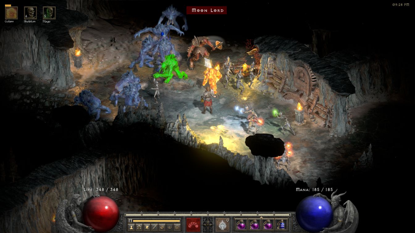 That strong golem did come with a drawback, however: the mana cost to summon the Fire Golem also grew at a fantastic rate as well. The Fire Golem skill costs a base 50 mana at the initial rank and then goes up by 8 additional mana for each skill point. That was another 48 mana by the end of the act for a grand total of 98 mana per golem, yeouch! You can look at the mana orb in these screenshots to see how Skelly was still a bit short of 200 total mana, meaning that he didn't even have enough mana to cast two golems before running out. This made using the skill pretty awkward and I hesitated to cast the golem too often for positioning purposes unless it was truly necessary. All those skill points also didn't make the Fire Golem any tankier either: more skill points only make the Fire Golem deal more damage, not survive longer, which would require more points in Golem Mastery via +skills items for additional life. Basically the fire golem could hit really hard but was only slightly more tanky than the individual melee skeletons. At least I didn't need corpses to re-cast the golem so it could always be re-summoned... assuming that Skelly had enough mana on hand.