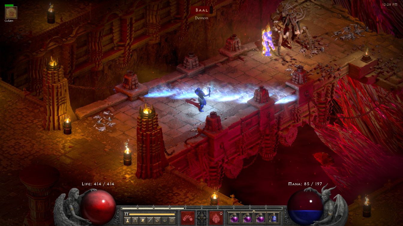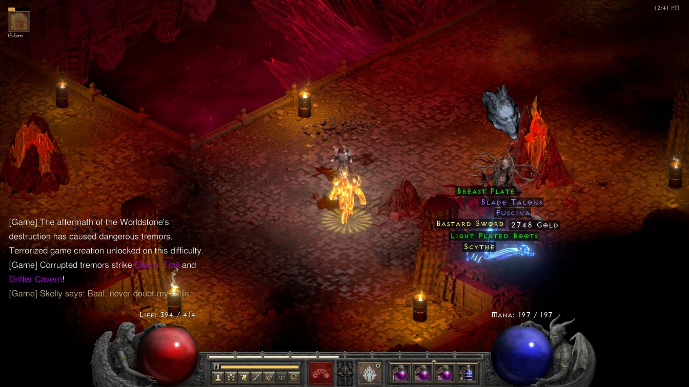 Baal wasn't going to be much fun since I knew Skelly would soon be left with nothing but his golem. I did my best to distract him with golems and the skeleton boys gave it everything that they had, however Baal simply had too much health and too much damage for them to last for long. Baal's lifebar was only halfway to the "L" when the last skeleton fell which meant that they contributed perhaps 10-15% of the overall damage. Then it was down to a whole lot of Fire Golem spellcasts and suddenly all those skill points that Skelly had dropped into the skill earlier didn't feel like a waste anymore. Baal has an obnoxious 26,000 HP and 33% fire resistance on Normal difficulty so it took some time for the golem to punch the demon to death even at nearly 200 damage per hit. Baal didn't make this any easier by blinking around the room constantly and then summoning his clone, though I paid close attention and made sure to keep the Fire Golem on the correct target. Most annoying of all was the fact that Skelly had to drink a mana potion after EVERY casting of Fire Golem, as he didn't have enough mana for another golem after each summoning. With Baal mowing down the Fire Golems in mere seconds, this meant consuming an awful lot of blue potions. I was going back to town and purchasing 18 of them at a time from Malah while still running short.