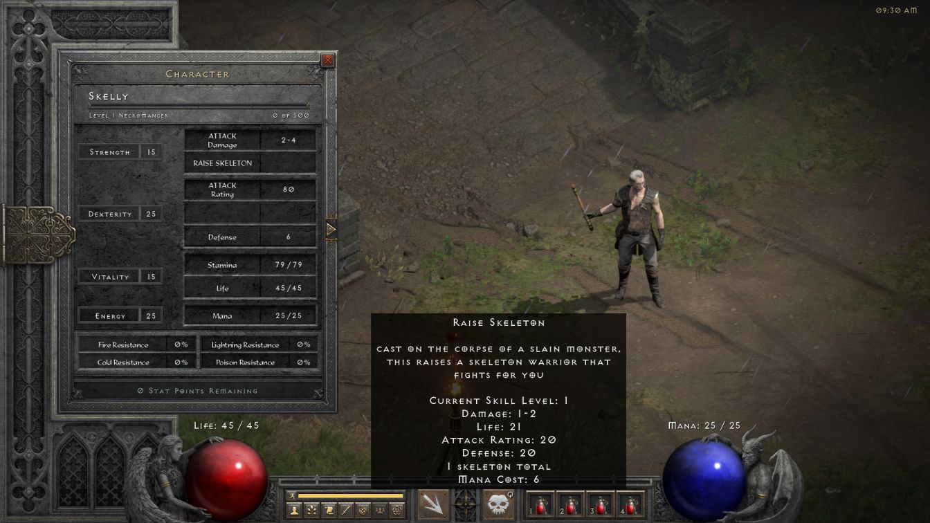 Anyway, this left Skelly with a single melee skeleton minion sporting the stats listed in the screenshot above. Raise Skeleton is a downright pitiful skill with only a single skill point invested, as the melee skeleton has a mere 21 HP and deals an embarassing 1-2 damage per swing. Sad as that might be, the fallens in the Blood Moor only have 2 HP and the quill rats only have 3 HP so this solitary skeleton was able to slowly cut down the denizens of the first outdoor area until Skelly hit CLVL 2 and could add a second skill point into the Raise Skeleton skill. Fortunately for Skelly, the summoning Necromancer is a character build that gets exponentially stronger with more skill points invested into the skeletons. The second skill point allows the Necromancer to raise a second skeletal warrior, and then the third skill point invested adds a third bony minion. After that, the Necromancer gains an additional skeletal warrior for every 3 additional skill points, with the fourth skeleton arriving at SLVL 6 and the fifth appearing at SLVL 9 and so on. More skill points starting with the fourth one also begin adding more health and damage to the skeletal warriors, with the net effect of the Necromancer getting double benefit: more health and damage on each skeleton compounding with more total skeletons on the field!