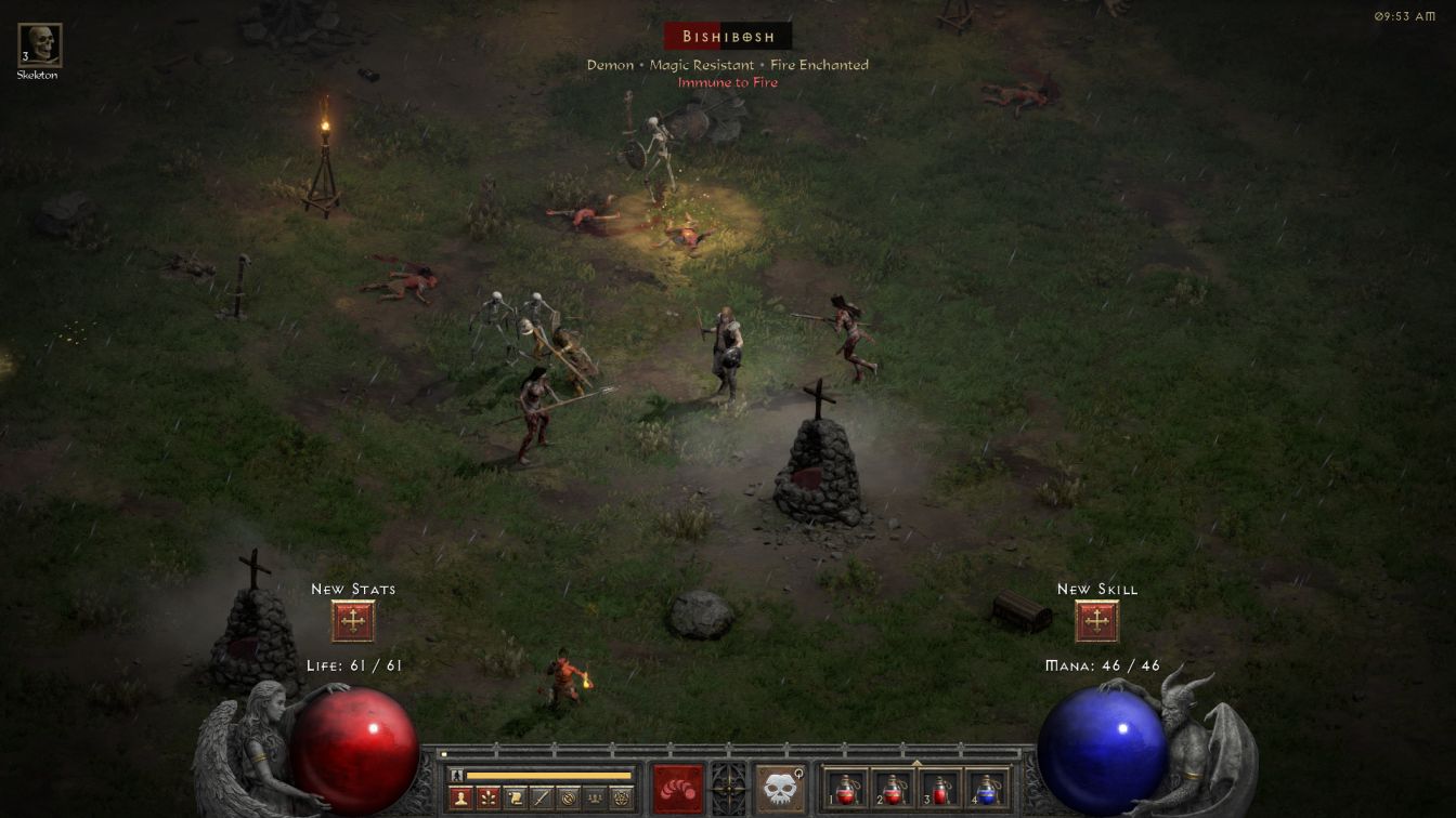 CLVL 12 arrived as Skelly was clearing out the Black Marsh and its two attendent dungeons, the Hole and the Countess quest. Skelly placed one skill point into the passive Golem Mastery skill, which grants golems extra life and movement speed but isn't worth investing more than the single skill point, and another saved skill pointo into Raise Skeletal Mage. This would be the other core summoning skill for Skelly, functioning in much the same way as Raise Skeleton but adding mages instead of melee warriors to the army. Each time that a corpse is converted into a skeleton mage, it has a chance to roll as fire, cold, lightning, or poison on the damage type. Information on the extra damage dealt by the mages has historically been difficult to access because it's never provided in-game, but there are third party websites like this slightly outdated one that have concrete numbers for the mages. The fire and lightning mages do the same amount of damage, with lightning having a wider range of potential damage rolls (if the fire mages deal 4-8 damage then the lightning mages will deal 2-10 damage, with both of them averaging 6 damage per shot). The cold mages deal about 75% the damage of the fire/lightning types but slow the target while poison mages inflict a slow-acting damage over time effect. The poison mages used to deal their damage over an ungodly long time but Patch 2.4 of D2R changed them so that their poison always lasts a fixed 4 seconds which greatly buffed their usefulness. The player can unsummon individual skeletal mages and try raising more corpses to get a specific type but usually I just use whatever the game gives me because it's helpful to have a mixture of several different elemental damage sources.