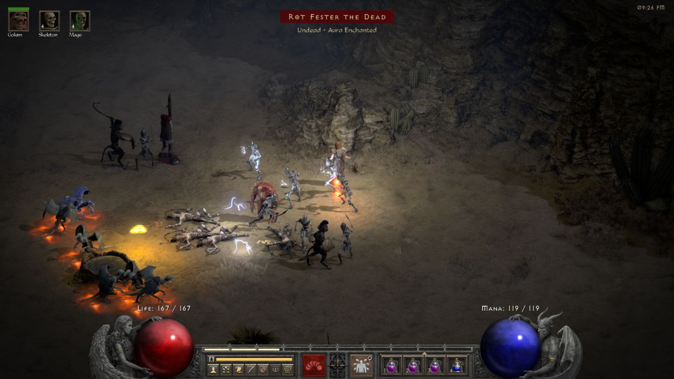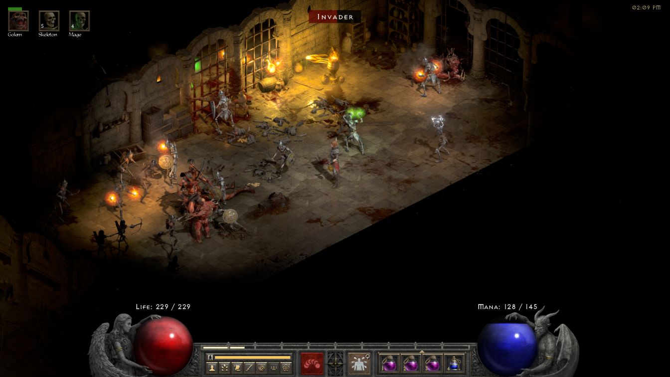 I've always loved the skeletal mages because their brightly-colored shots look so awesome in practice. Skelly had a fire, lightning, and cold mage in the screenshot and that was a really nice combination for both dealing damage and providing minor crowd control. The summoning Necromancer never really needs to worry much about damage immunities because their mages allow them to access every element and handle any combination of resistances. From what I can tell on third-party websites, the fire/lightning mages actually deal the identical amount of damage as the melee skeletons, assuming the same skill level for their two skills, only attuned to their respective elements instead of physical damage. Thus the warriors and the mages are basically equivalent in damage output, though it can sometimes be tough to get all of the melee fighters into the action simultaneously. Aside from having different damage types, it's also really useful to have both mages and melee skeletons due to basic space concerns: there's rarely enough room for every melee skeleton to hit the same target, made even worse when fighting in tight underground spaces or through doorways. Having a bunch of mages on hand to hit targets at range helps enormously in this regard even though they often spend a lot of time standing around doing nothing too for lack of a target.