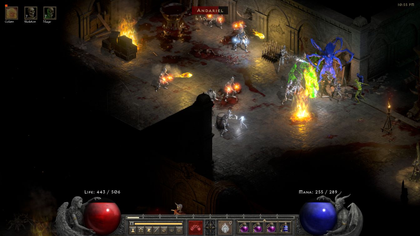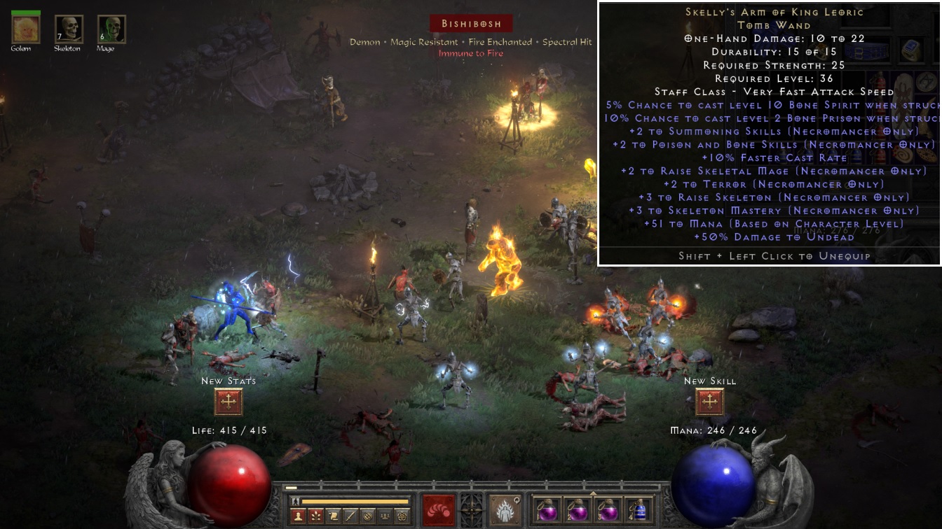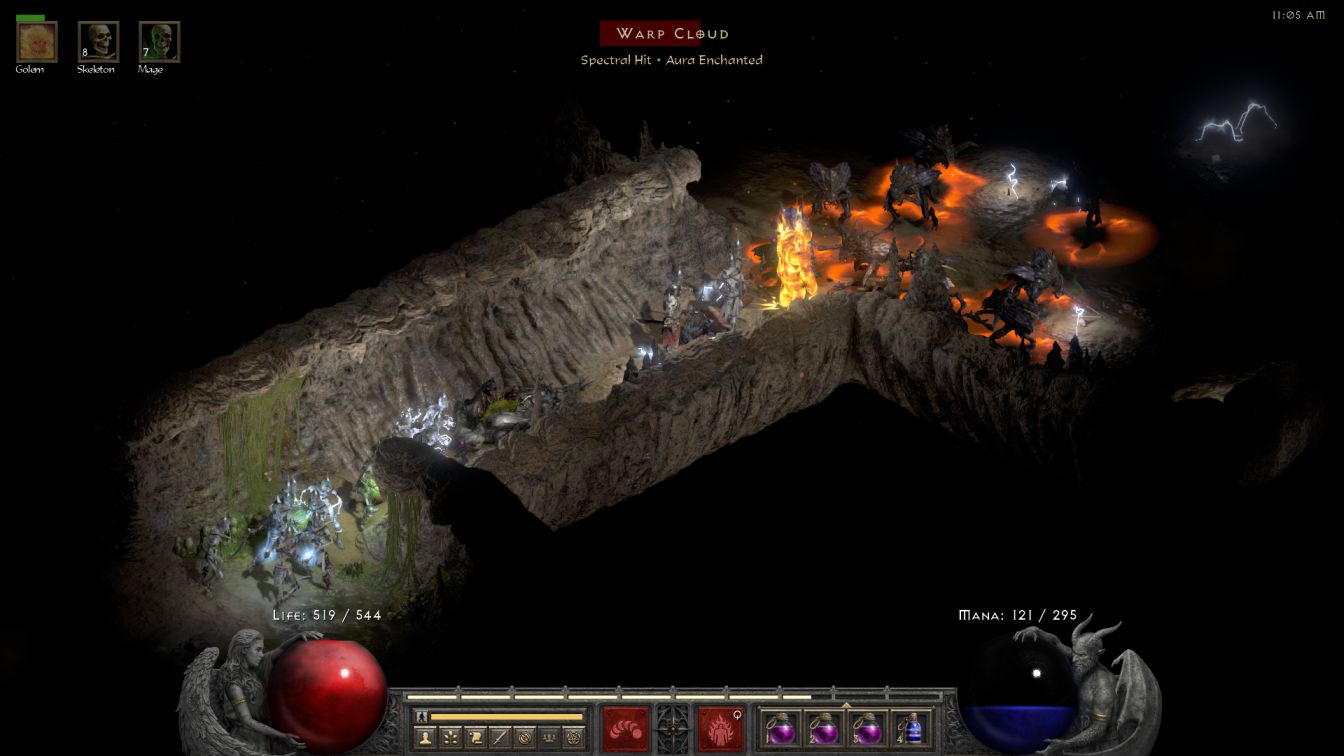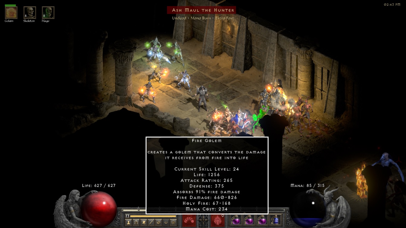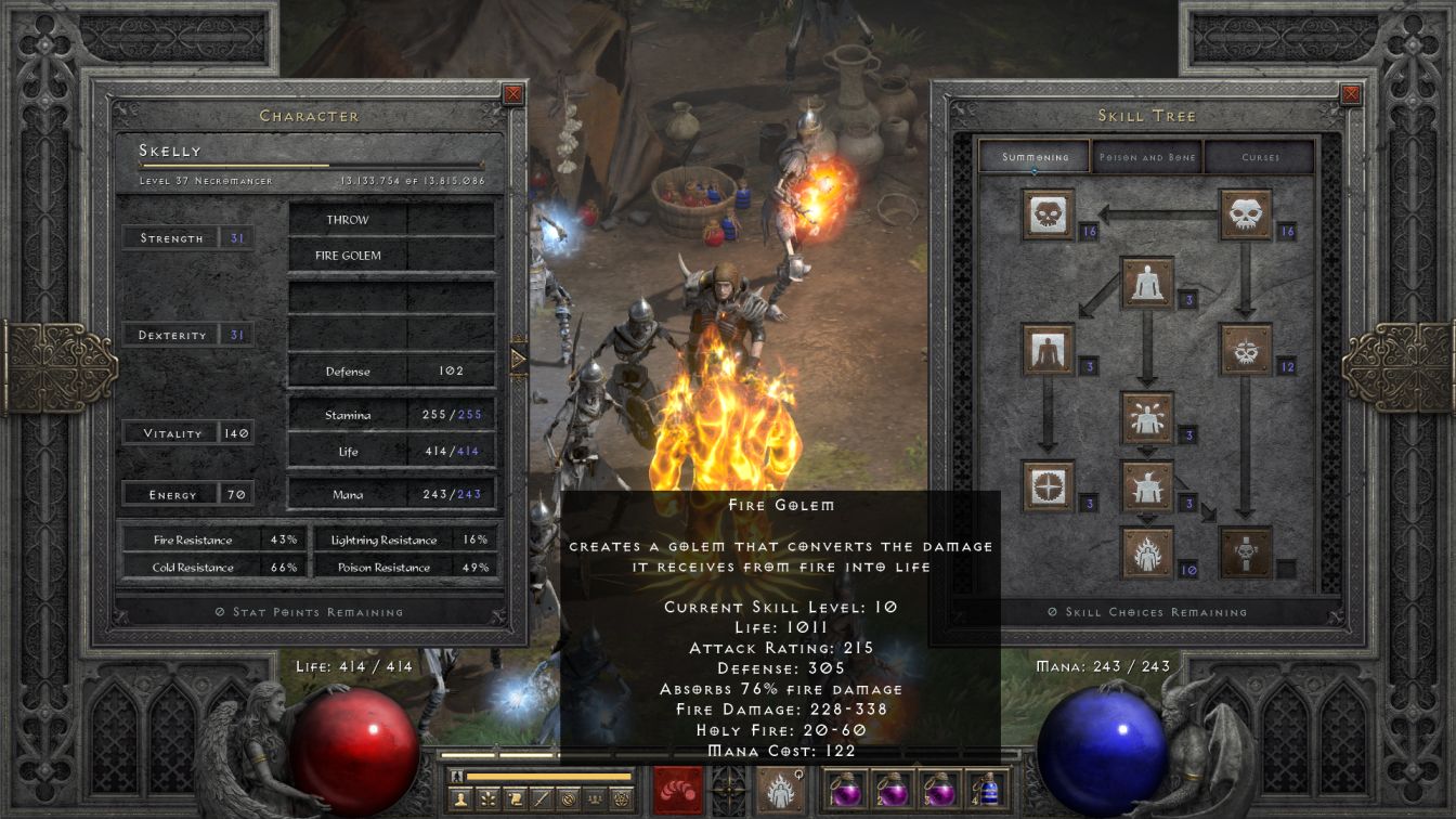 But it wasn't just the army getting bigger in numbers, each of the summons had also become stronger as well. The melee skeletons had seen their damage soar up to 78-80 per swing, with the skeleton mages presumably rising to a similar range although the in-game data never explicitly states their numbers. The skeleton warriors had also increased to 353 HP apiece and this wasn't solely due to the additional skill points that Skelly had picked up. The Necromancer's minions also recieve additional health whenever the difficulty level increases, for whatever reason scaling up alongside the monsters to some extent. Note that the skills did *NOT* work this way in earlier patch versions of Diablo 2. Thus the skeletons had received modest health increases while the Fire Golem was the biggest beneficiary as it now topped 1000 HP. That same Fire Golem had been sporting 453 health at the tail end of Normal difficulty and gaining a single skill point in Fire Golem and Golem Mastery certainly hadn't been enough to more than double its lifebar. Skelly wasn't complaining though as the gameplay worked to beef up his minions to face the higher difficulty setting.