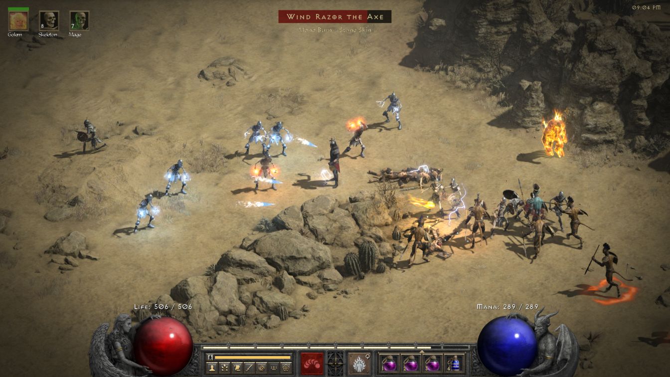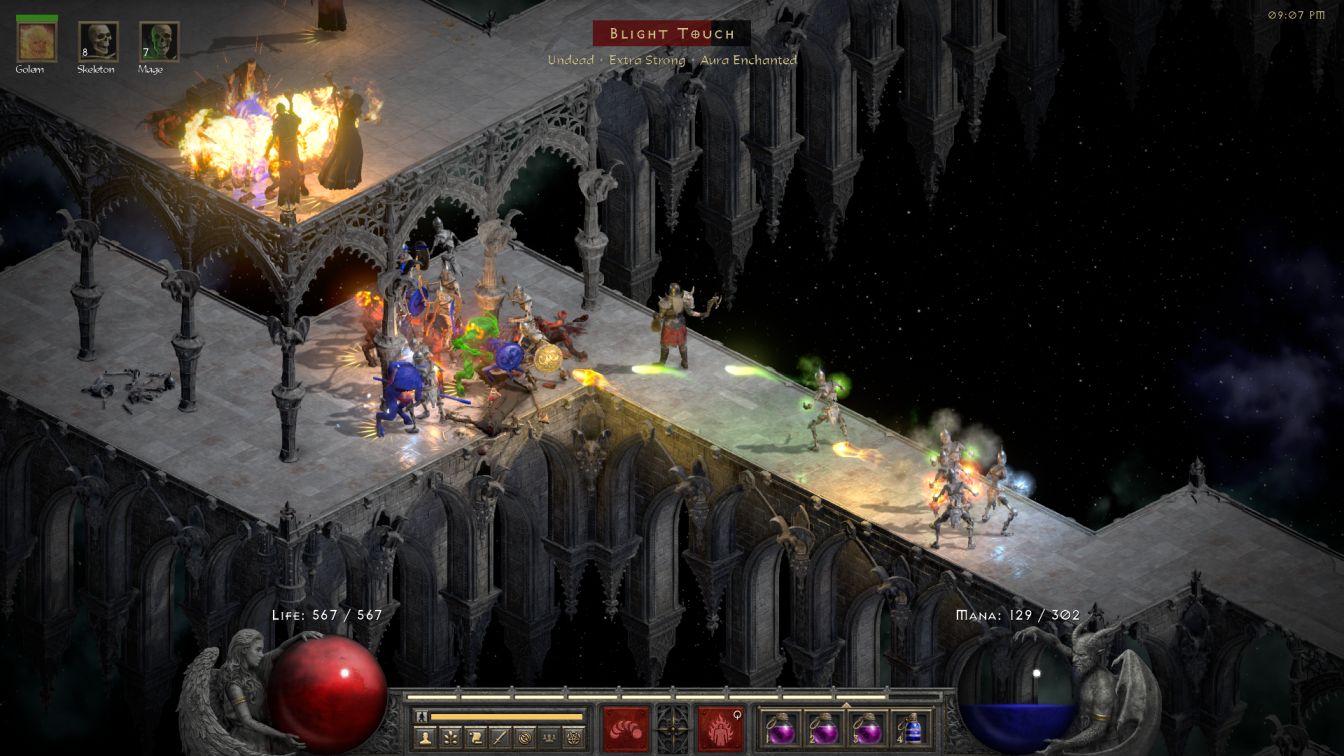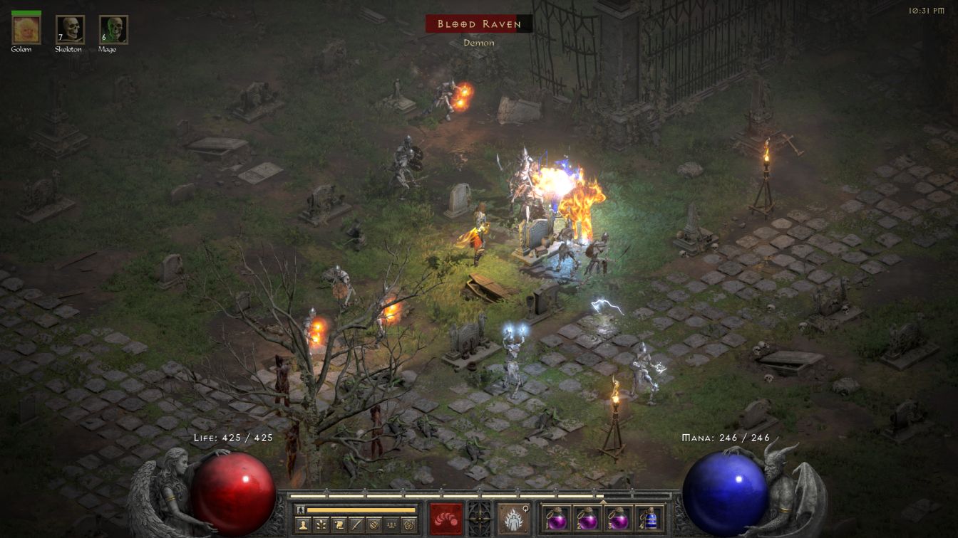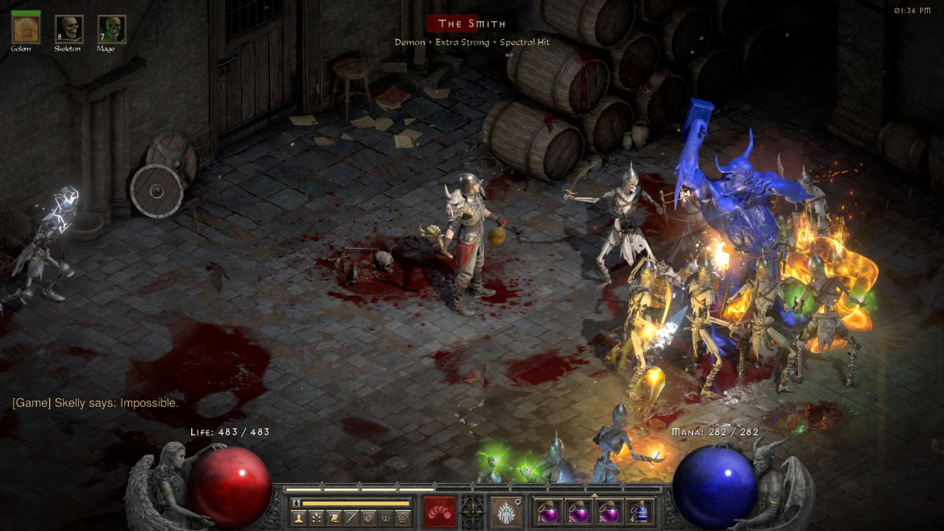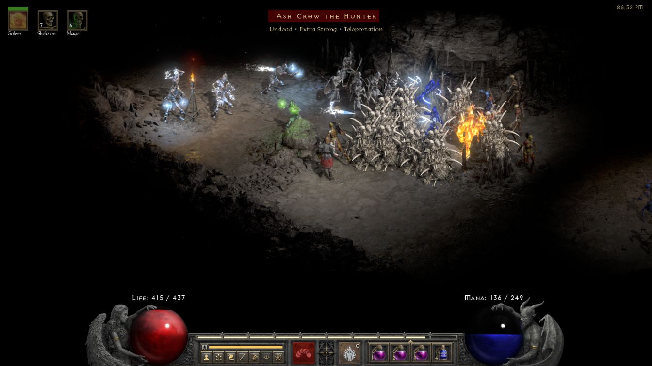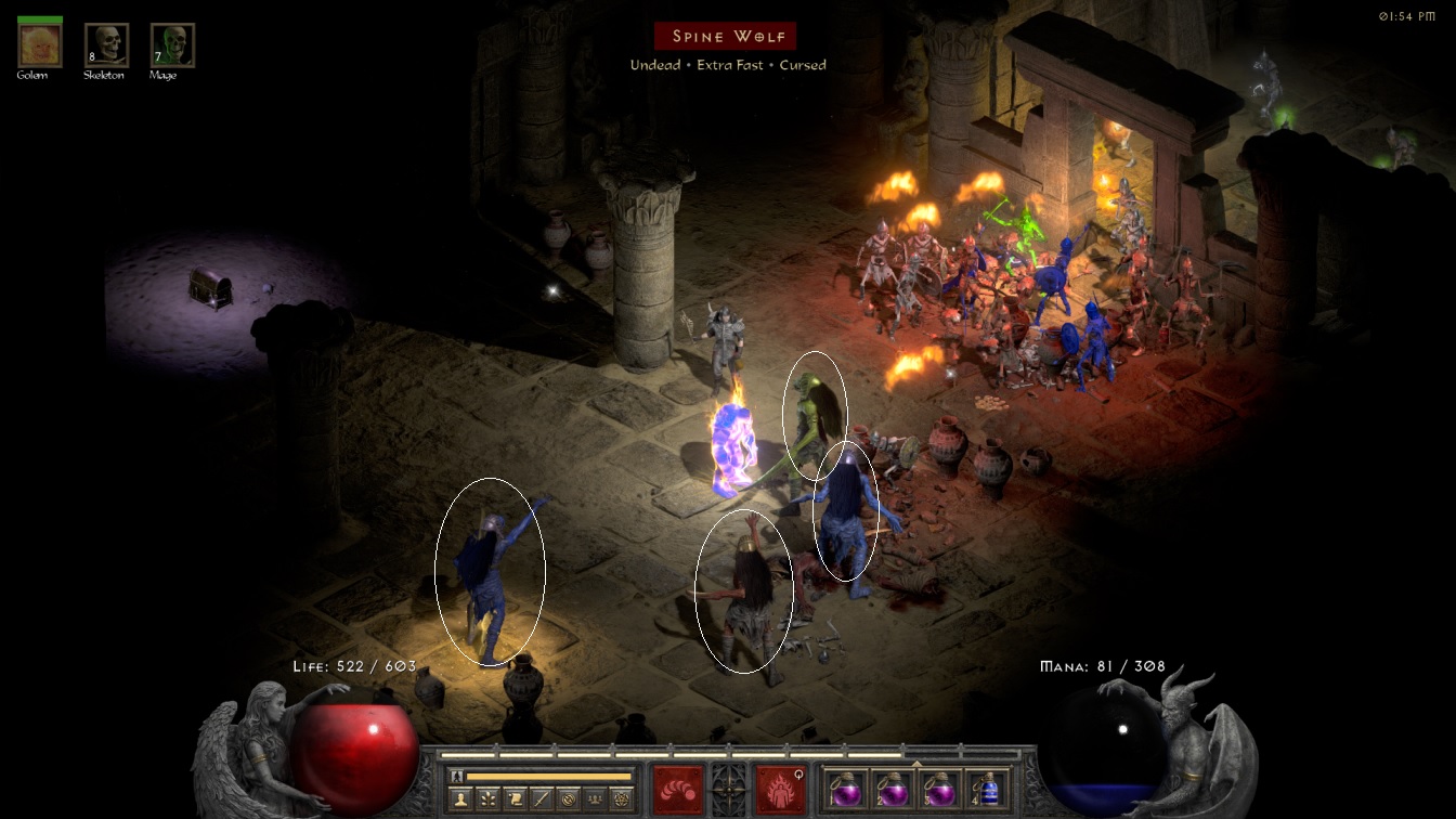 But it wasn't just the army getting bigger in numbers, each of the summons had also become stronger as well. The melee skeletons had seen their damage soar up to 78-80 per swing, with the skeleton mages presumably rising to a similar range although the in-game data never explicitly states their numbers. The skeleton warriors had also increased to 353 HP apiece and this wasn't solely due to the additional skill points that Skelly had picked up. The Necromancer's minions also recieve additional health whenever the difficulty level increases, for whatever reason scaling up alongside the monsters to some extent. Note that the skills did *NOT* work this way in earlier patch versions of Diablo 2. Thus the skeletons had received modest health increases while the Fire Golem was the biggest beneficiary as it now topped 1000 HP. That same Fire Golem had been sporting 453 health at the tail end of Normal difficulty and gaining a single skill point in Fire Golem and Golem Mastery certainly hadn't been enough to more than double its lifebar. Skelly wasn't complaining though as the gameplay worked to beef up his minions to face the higher difficulty setting.