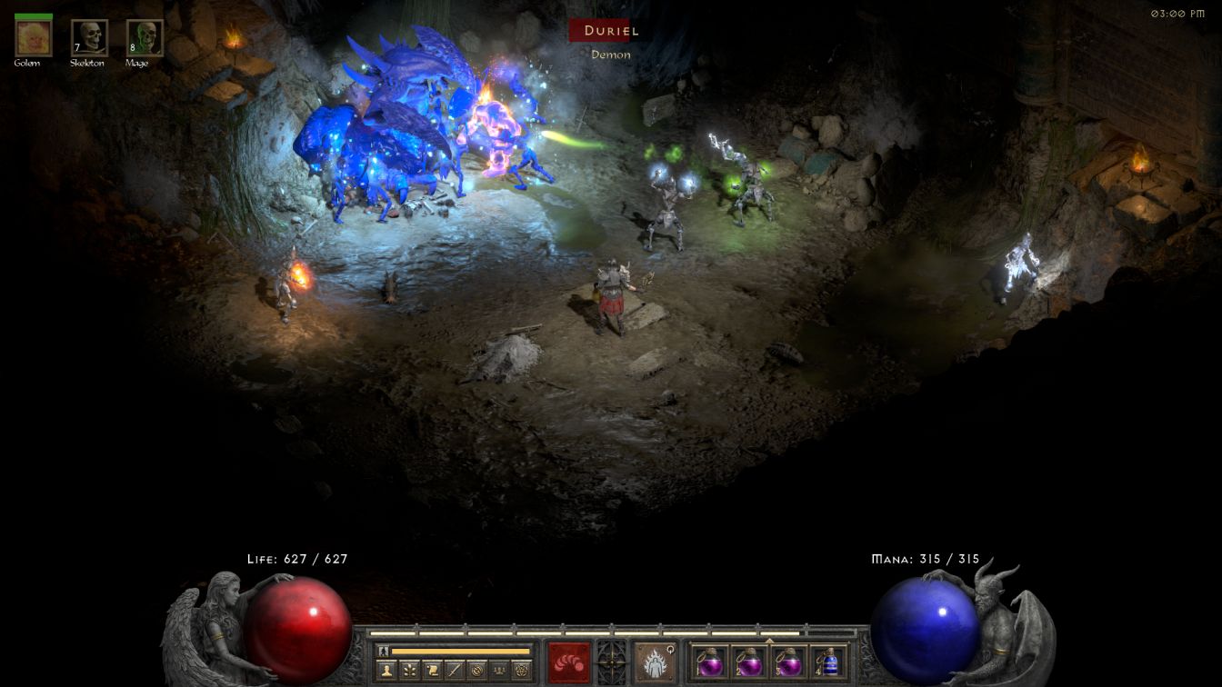 On that note, much as I dislike the Duriel boss encounter, this is one of the few places in the game where resistances are completely meaningless since Duriel does entirely physical damage outside of his Unholy Freeze aura. Skelly made sure to bring a full skeleton army into the tiny boss room along with an inventory full of blue potions for the inevitable recastings of the golem. Most of the skeleton mages ran into good firing positions while the melee skeletons and the golem raced over to confront the big demon. Duriel chomped through the Fire Golem first, then turned to attack the skeletal warriors even as I immediately recast the golem. He ate five melee fighters in total before turning back to the golem, after which I was able to keep him occupied with a series of golems for the rest of the fight. Skelly drank close to a dozen mana potions, needing a new one for each new golem casting, while the skeleton mages did most of the hard work. The golem and the melee skeletons were almost useless against this boss due to that freezing aura slowing their attack speed to a crawl. Good thing most of the skeleton mages stayed back out of the chilling aura and remained there until the fight was over. Three of the skeletal warriors and all of the mages were still alive when Duriel bit the dust.