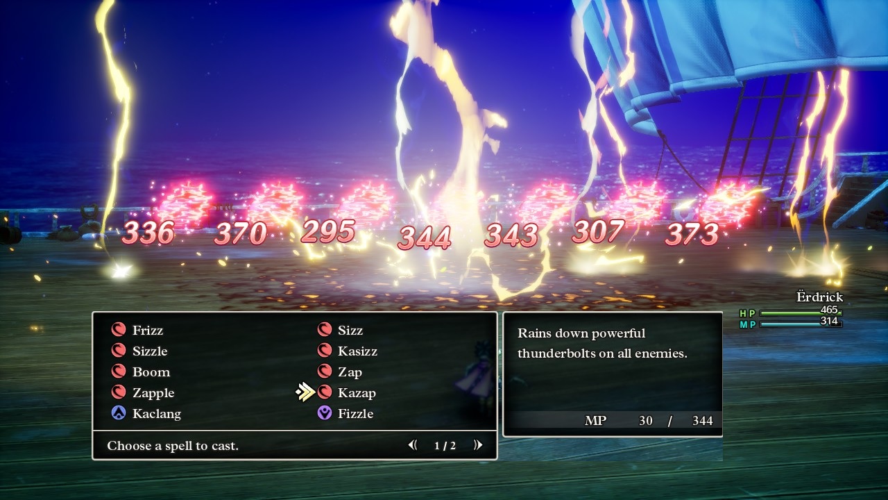 This is also a good time to discuss how spell damage interacts with the Wisdom stat. Remember how each character's critical strike chance gets boosted (or decreased) by comparing their Luck stat against a predetermined table of values? The exactle same table is used is used for the Wisdom stat, and for every 1 point of Wisdom above the number on that table, the damage of the spell being cast gets boosted by 1%, up to a maximum cap of 60% additional damage. Thus Kazap had a base damage of 175-225 but could deal up to 280-360 max damage with a heightened Wisdom stat, which Erdrick of course had due to eating all of those Wisdom seeds. It also helped that these Sea Slimes were weak against lightning element and took additional damage (thus the red text on the damage numbers) to make the overall effect even more spectacular. Erdrick's boomerang attacks were plenty good enough for most combats in the sea but she could also break out this spell whenever she felt impatient or annoyed.