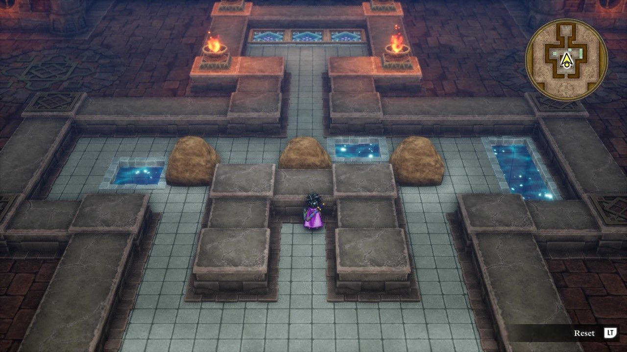 The player has to push these three rocks into the diamond tiles in the back without getting them stuck or pushing them into the water. Decades and decades after playing this game on the NES, this stupid rock puzzle was one of the things that I most remembered about Dragon Warrior 3, heh. Let the record show that I was able to finish the puzzle while playing the game on Livestream without having to look up the solution online! It's not really that hard but sheesh, do I remember getting stuck here in the pre-Internet age for quite some time. Anyway, the quest reward for solving this puzzle was the Bottomless Pot (the Vase of Drought in the NES translation), which then gets used in the ocean north of Siberia to raise a small underwater shrine containing the Ultimate Key inside. That allows the player to unlock every door in the game and it's necessary to advance the plot eventually, though the player can continue skipping it for some time if desired.