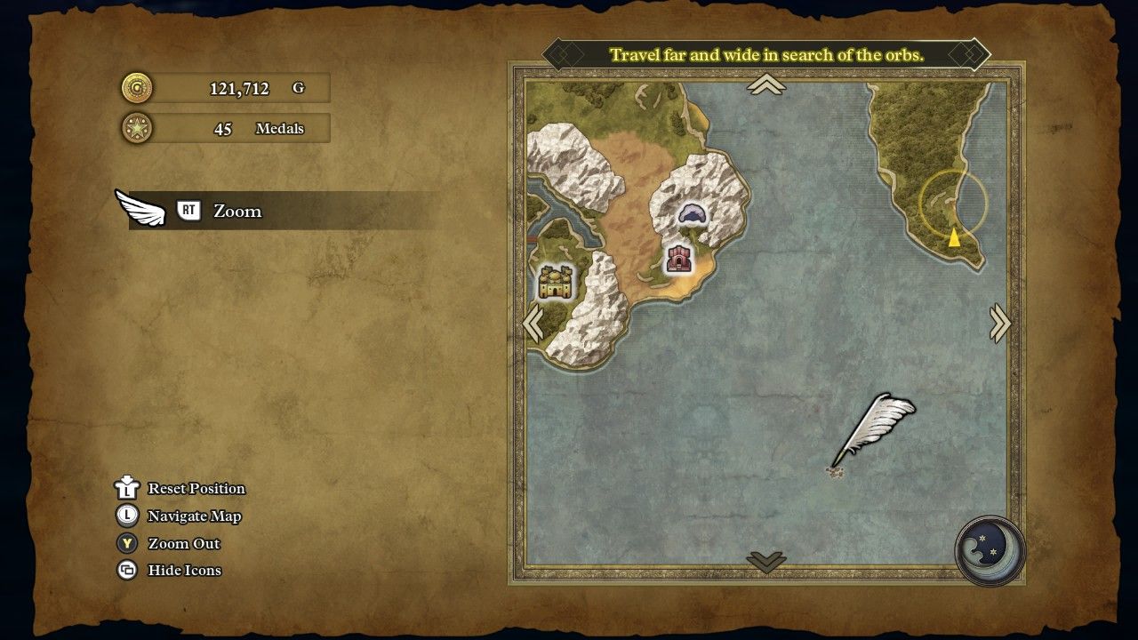 Aside from that diversion though, Erdrick spent a lot of time sailing around the map and uncovering sparkling and secret spots. Like, a loooooot of time doing this. There were three different sparkly locations visible in the screenshot that I took above in the middle of North America's river system, and then two more of them just off screen that I couldn't get into the same picture. In fact, the Persistence region alone has nearly 20 sparkly spots (!) in this otherwise deserted portion of map. There were many, many more of them to be found further north in "Grimland" and the Canadian archipelago, then a bunch more running along both the eastern and western coasts of South America. There's also a Pirate Den down near real world Tierra del Fuego where the Red Orb is just sitting unguarded in a basement. I would have thought that the HD-2D remake would add some kind of boss fight, or something of any kind, but nope, it's literally just there to be picked up for free, same as in the NES game. Well OK then, I guess some parts of this world-saving quest were going to be easier than expected.