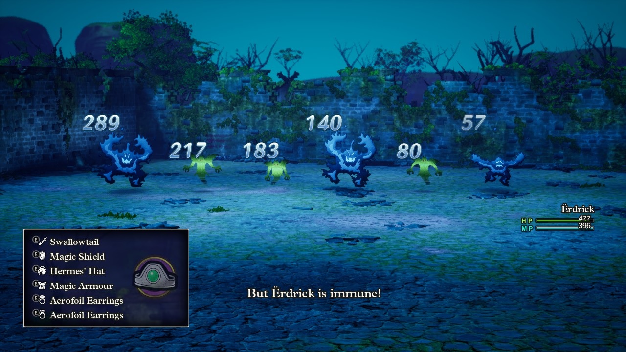 Erdrick was confronted by six enemies at once, three Phantasm ghosts and three Dying Fires. The ghosts like to cast the tier 1 explosion spell Bang while the Dying Fires employ heavy wind element damage, between the tier 2 wind spell Swoosh and the same Wind Sickles attack that Erdrick had seen back in the Pyramids. They can also cast the instant death spell Whack which Erdrick countered by putting some Diamends in her inventory, items that shatter to stop the successful casting of a death spell. I had strategized for this battle ahead of time and equipped Erdrick with her Magical Armor, the Hermes' Hat which reduces wind element damage by 33%, and then a pair of Aerofoil Earrings which each reduced wind element damage by a further 25%. Together this was enough to completely negate all wind damage entirely, with Swoosh and Wind Sickles both dealing zero damage whenever they appeared. As for Bang, it was a tier 1 party-wide spell that hit for 12-18 damage normally, reduced by another third from the Magical Armor down to 8-12 damage. Erdrick could certainly survive that.
