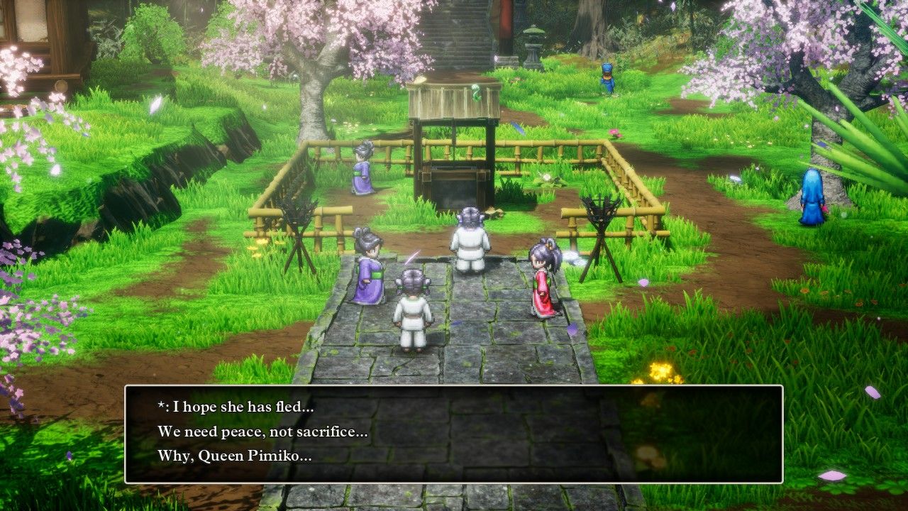 With the first orb sitting in her pocket, Erdrick continued onwards in search of the remaining five. This was a genuinely confusing task in the NES version of the game, as the gameplay didn't even tell the players that they had to find orbs in the first place, much less where they were located across the vast world. Here in the HD-2D remake, there are giant yellow circles on the minimap indicating where all of them can be found and a series of quest objectives pointing the way forward, though to be fair these can be turned off in the options menu if desired. These cheet sheets in the sky led Erdrick onwards to the island nation of Jipang which was based on... I mean, does it honestly require explanation? Everyone in Jipang speaks in haikus and the problem here is that Queen Pimiko has to keep sacrificing young girls to a terrible monster named the Orochi to prevent the village from being destroyed. This place looked absolutely gorgeous with the cherry blossoms falling in the background even if everything here was yet another cultural stereotype.